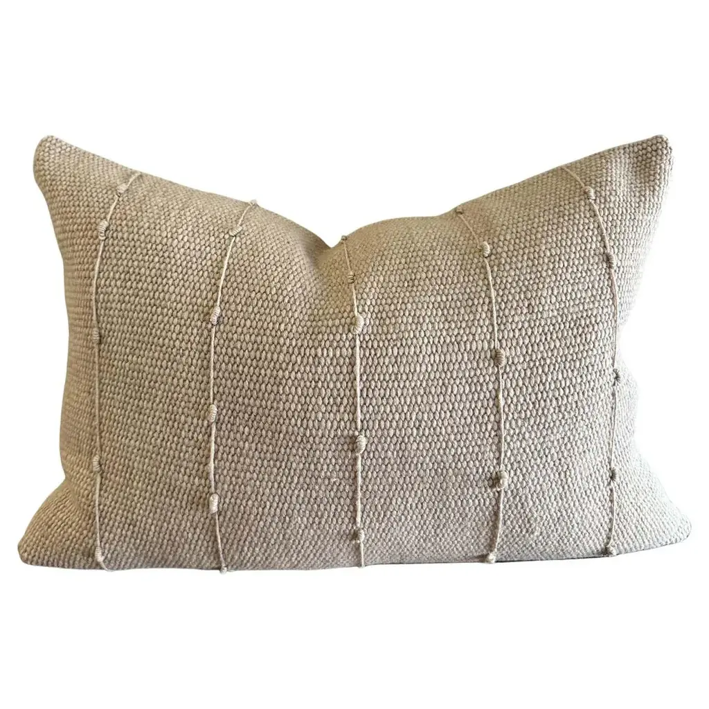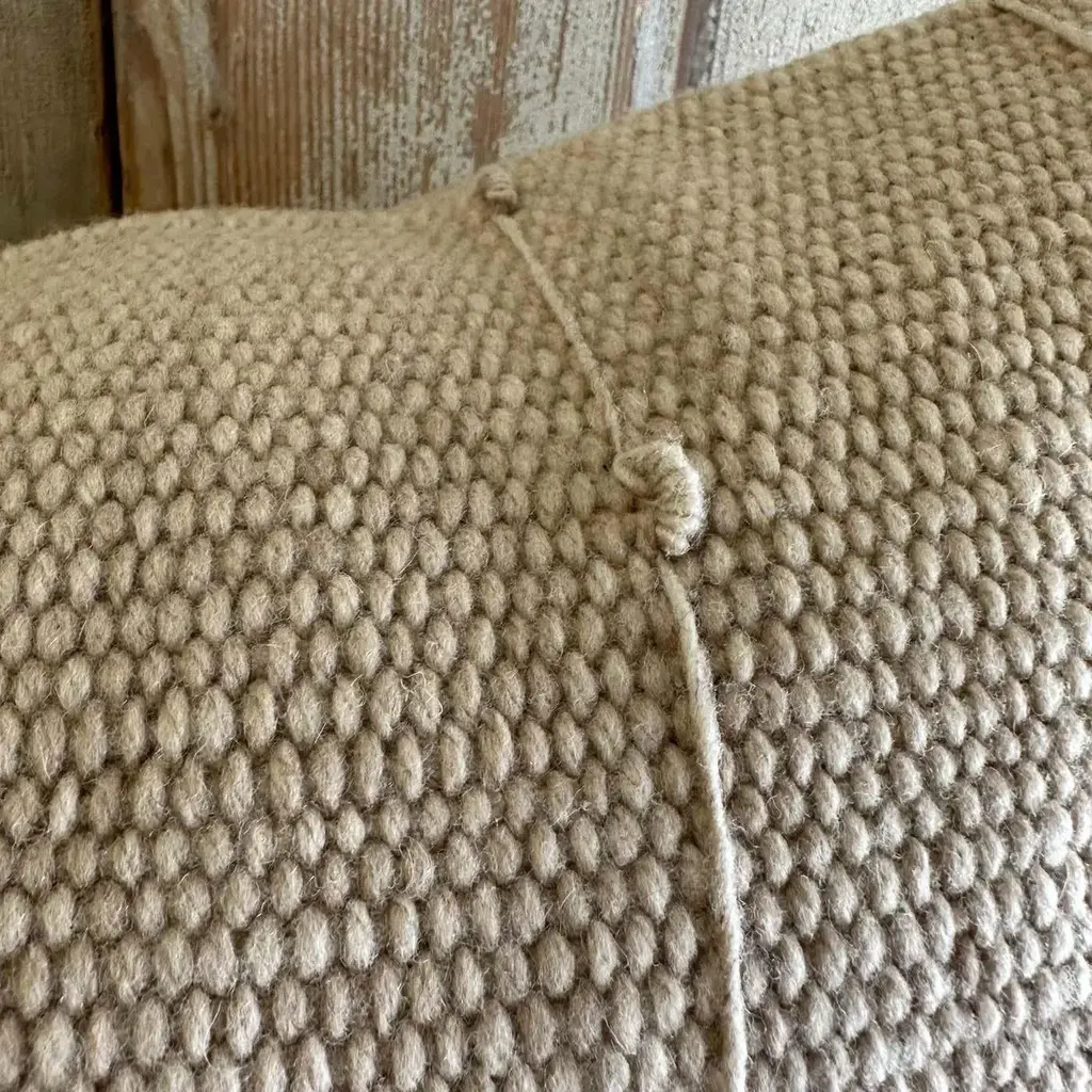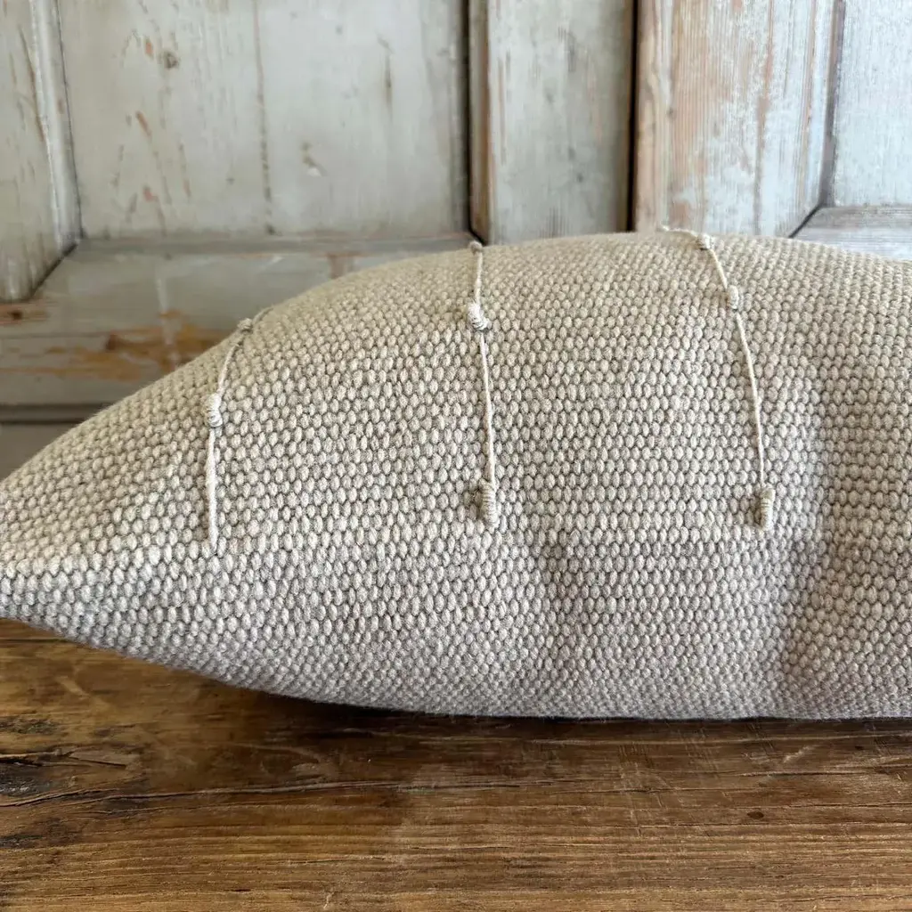 Wool Alpaca accent pillow from . A beautiful natural oatmeal pillow with stripes. Large wood yarns woven to create a beautiful texture. Hidden zipper closure. Due to the unique yarns, the color varies which are normal and to be expected. If this item is backordered please allow 6-8 weeks for production. The textiles are made with 100% wool from ’Chilota’ sheep, that are born and raised on the island. The process by which these luxurious wool pieces are made starts with shearing the sheep, cleaning the wool in hot water to remove the natural oils of the sheep, drying and spinning the wool into fine threads before hand weaving into unique textile patterns and textures. The textiles we use are colored by natural dyes using leaves, barks, roots, branches or mineral elements. Their main characteristic is their capacity to adapt to difficult weather conditions which makes their wool resistant, flexible and durable. Color of yarn varies, can appear lighter or darker Includes down/feather insert. Size: 15" x 24"