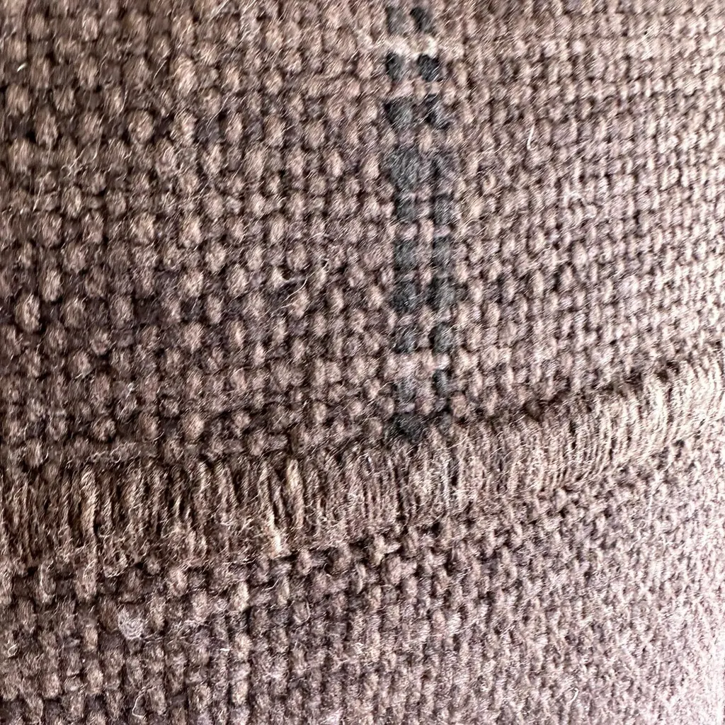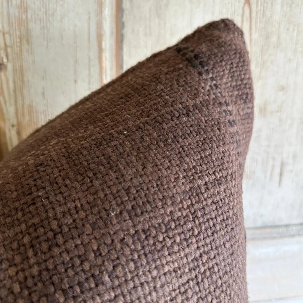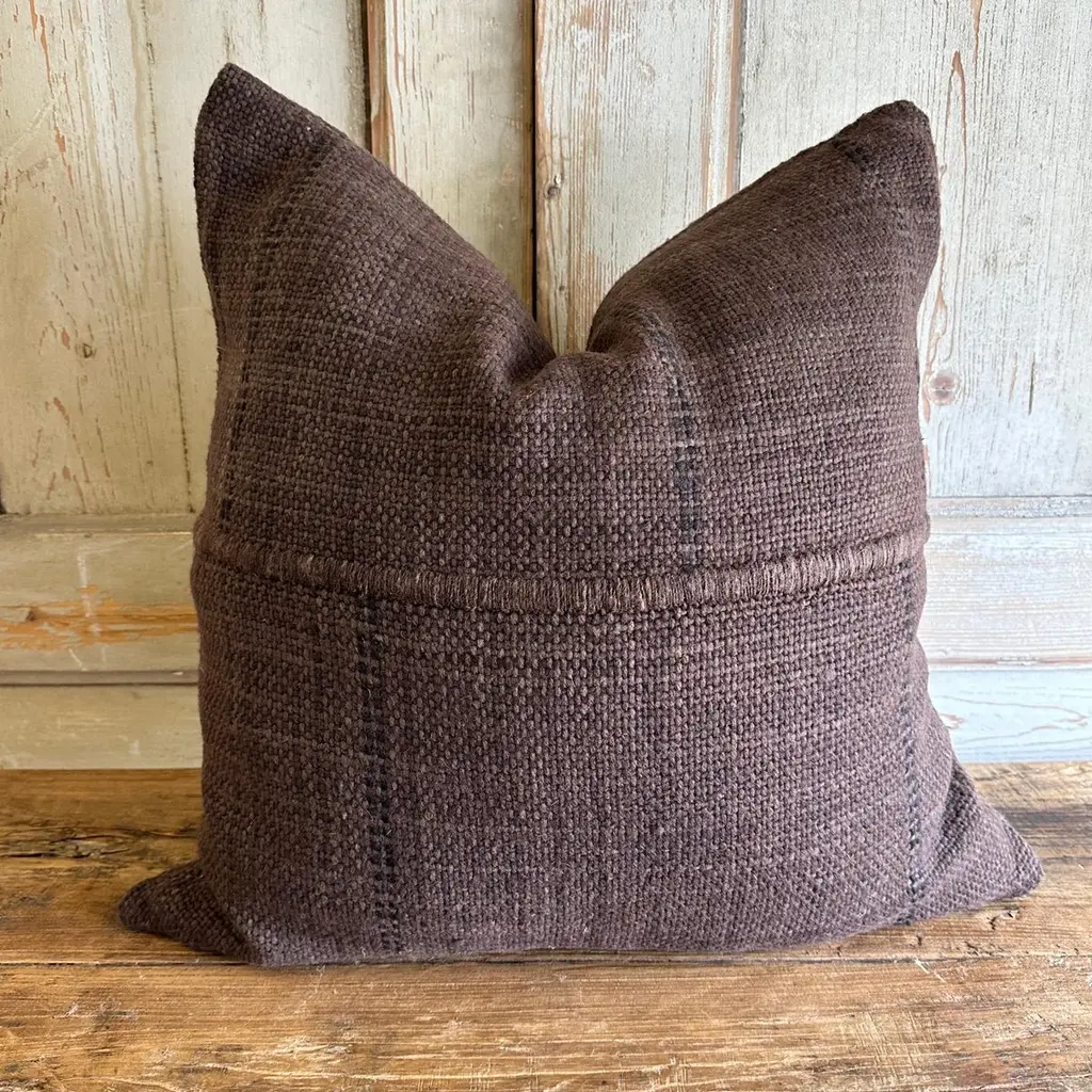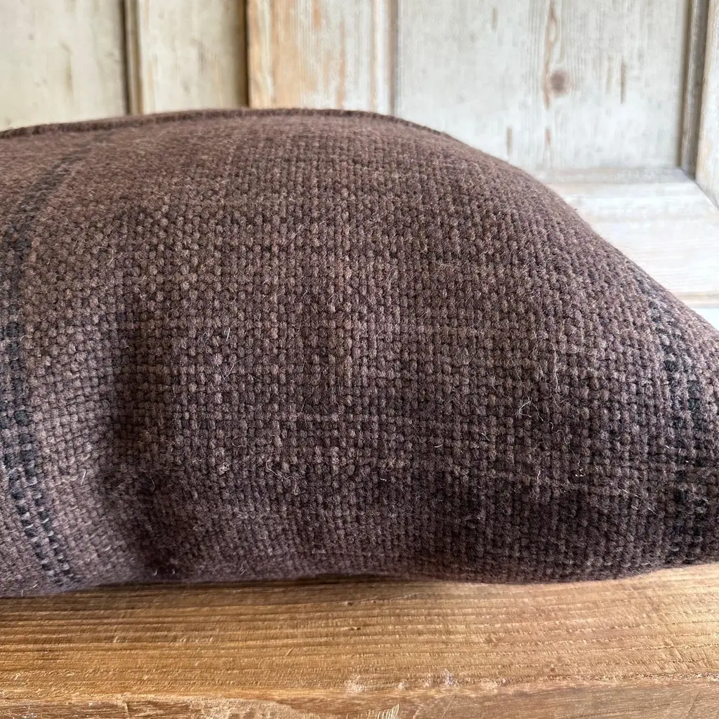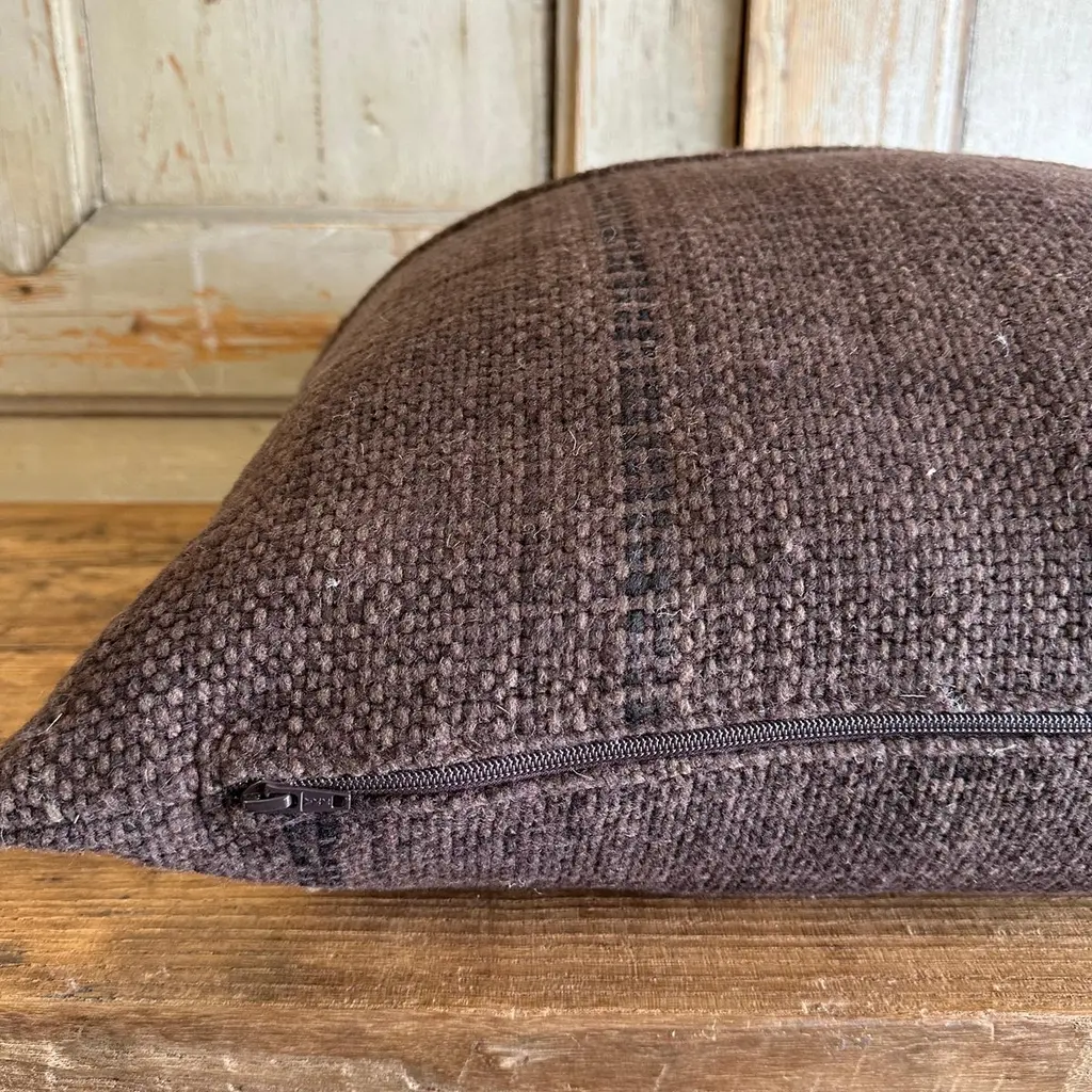 Wool Alpaca accent pillow from. A beautiful rich coco brown and dark brown dot stripe pillow. Large wood yarns woven to create a beautiful texture. Hidden zipper closure. Due to the unique yarns, the color varies which are normal and to be expected. If this item is backordered please allow 6-8 weeks for production.Size: 24x24, includes down/feather insert.The textiles are made with 100% wool from ’Chilota’ sheep, that are born and raised on the island. The process by which these luxurious wool pieces are made starts with shearing the sheep, cleaning the wool in hot water to remove the natural oils of the sheep, drying and spinning the wool into fine threads before hand weaving into unique textile patterns and textures. The textiles we use are colored by natural dyes using leaves, barks, roots, branches or mineral elements. Their main characteristic is their capacity to adapt to difficult weather conditions which makes their wool resistant, flexible and durable.Color of yarn varies, can appear more dark.