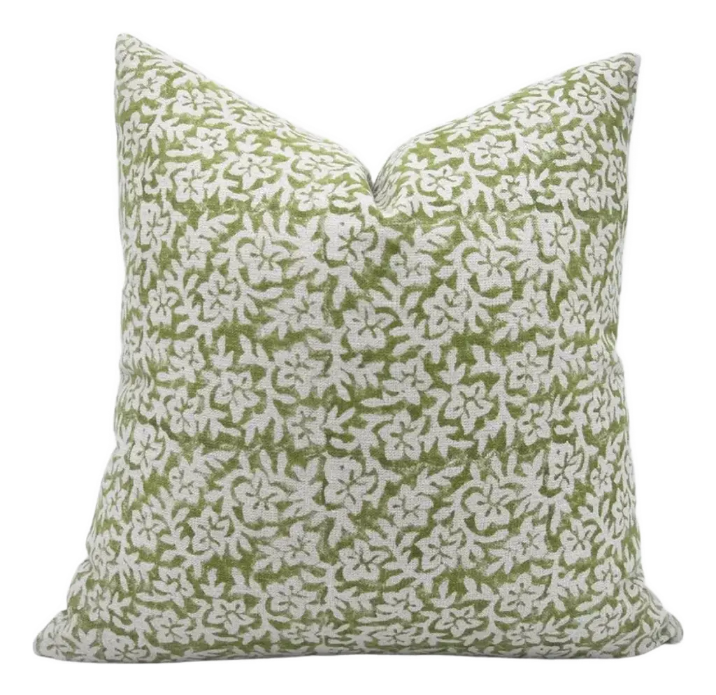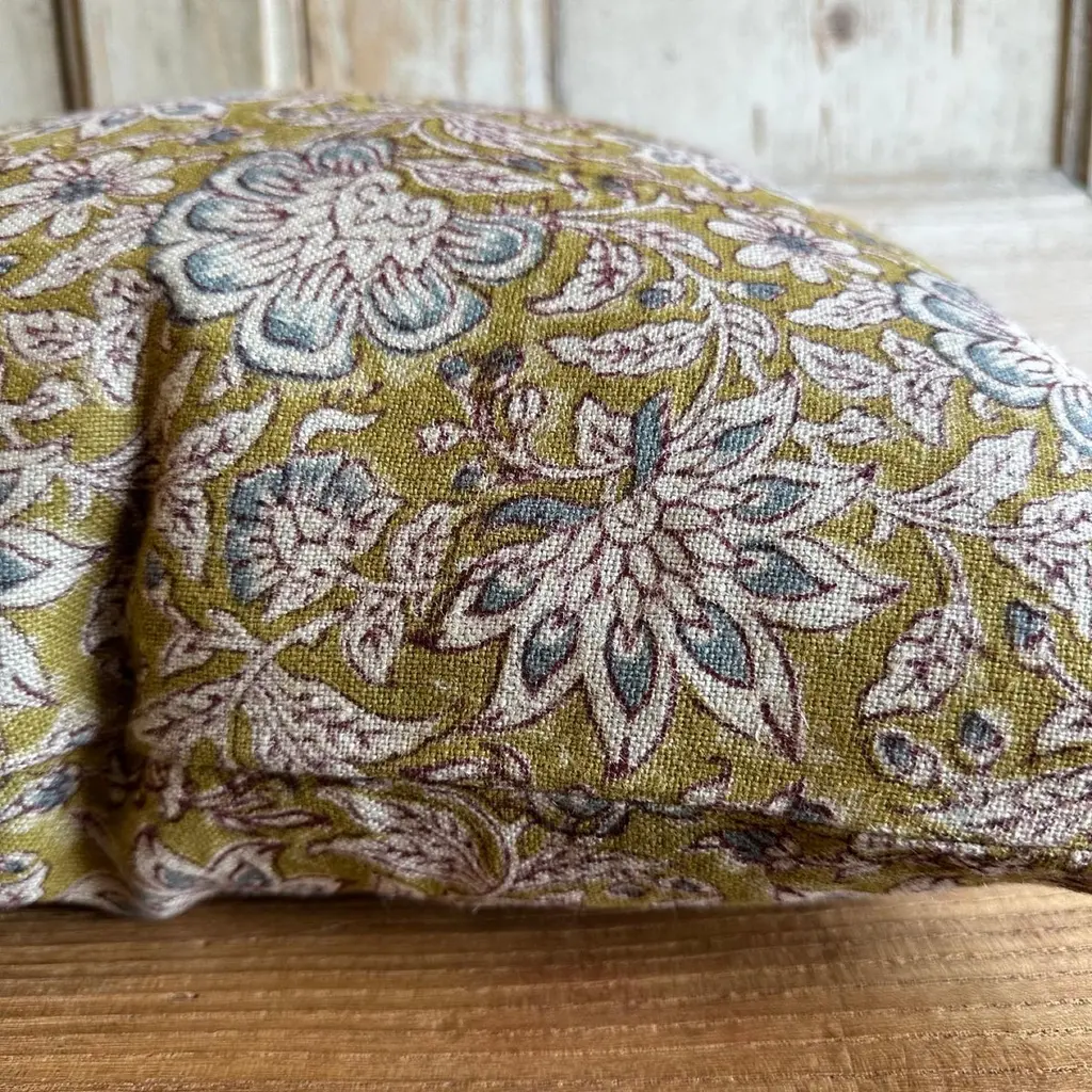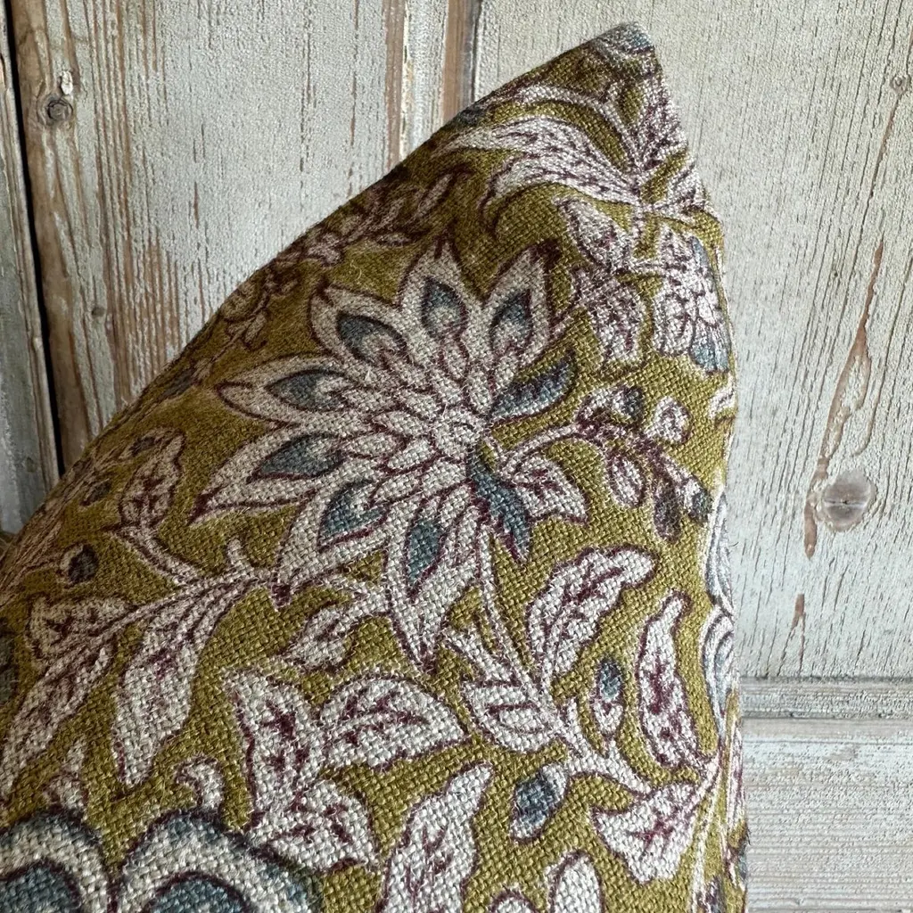 Beautifully hand block-printed pillow on heavy linen fabric.Zipper closure. Double Sided Pillow, Front and Back show the same block-printed linen.Care Instructions: Dry clean recommended.