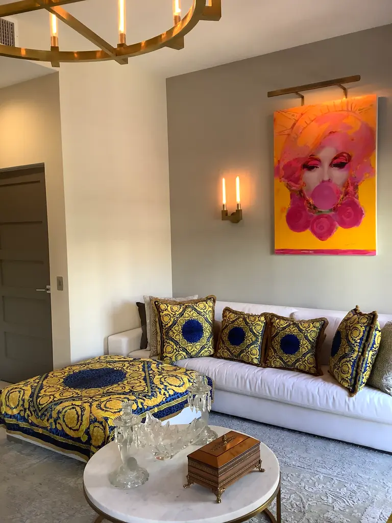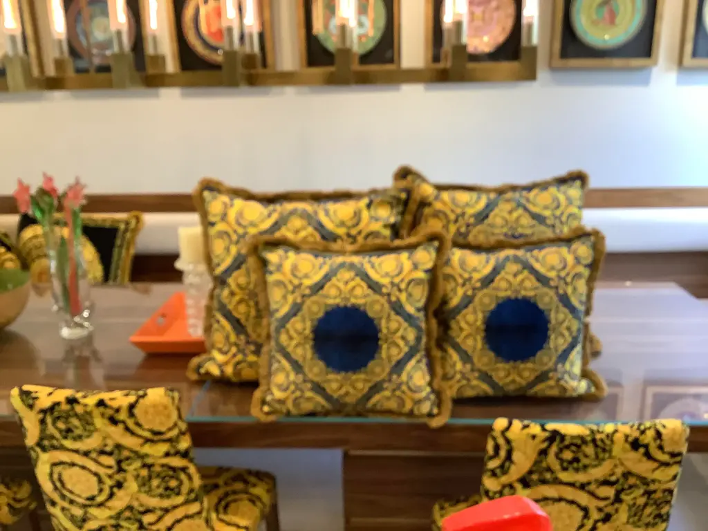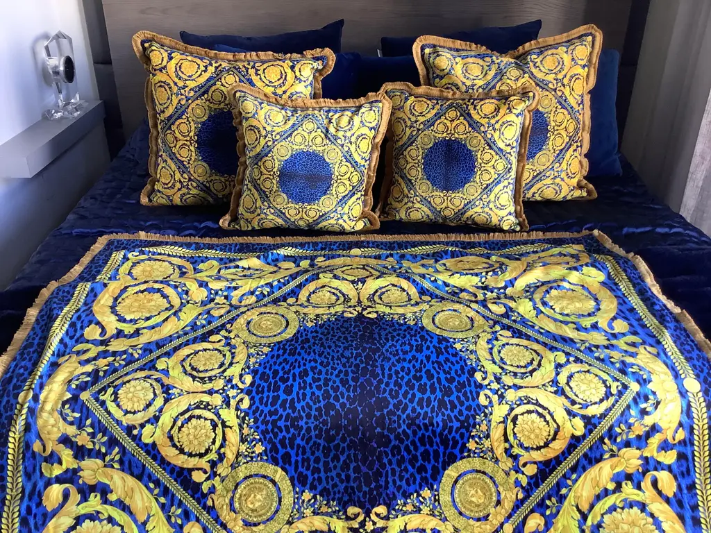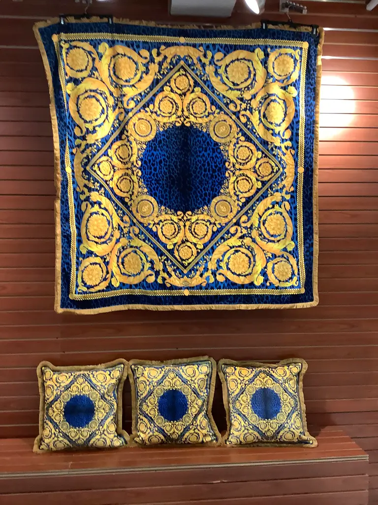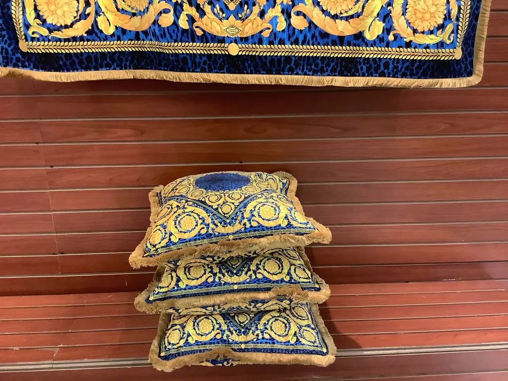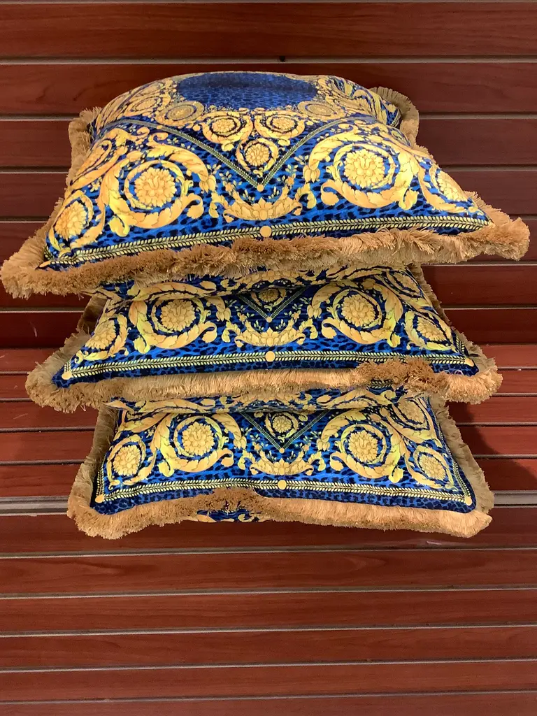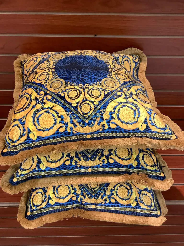 Set of 3 custom made atelier Versace pillows 18”18” made from vintage heavy upholstery fabric blue gold baroque this pillows are custom made from heavy upholstery fabric pillow will come with inserts
