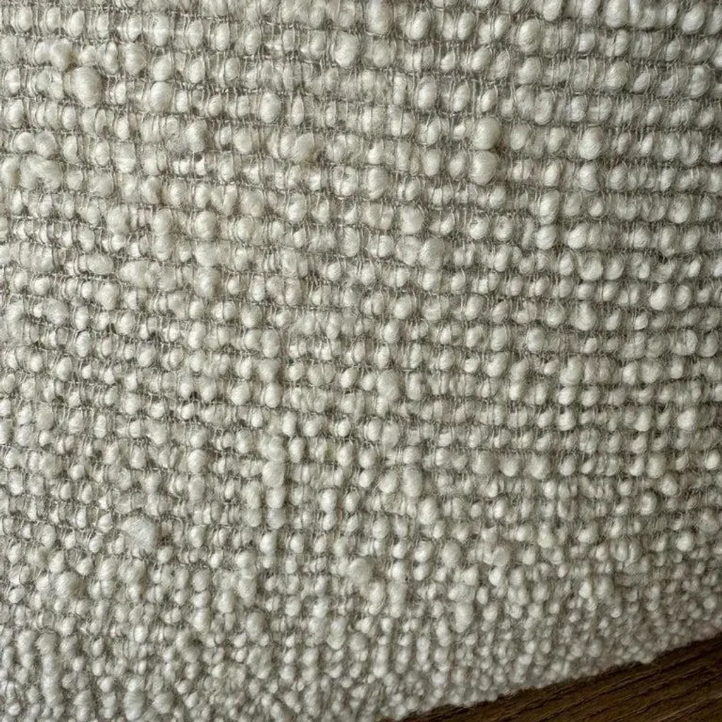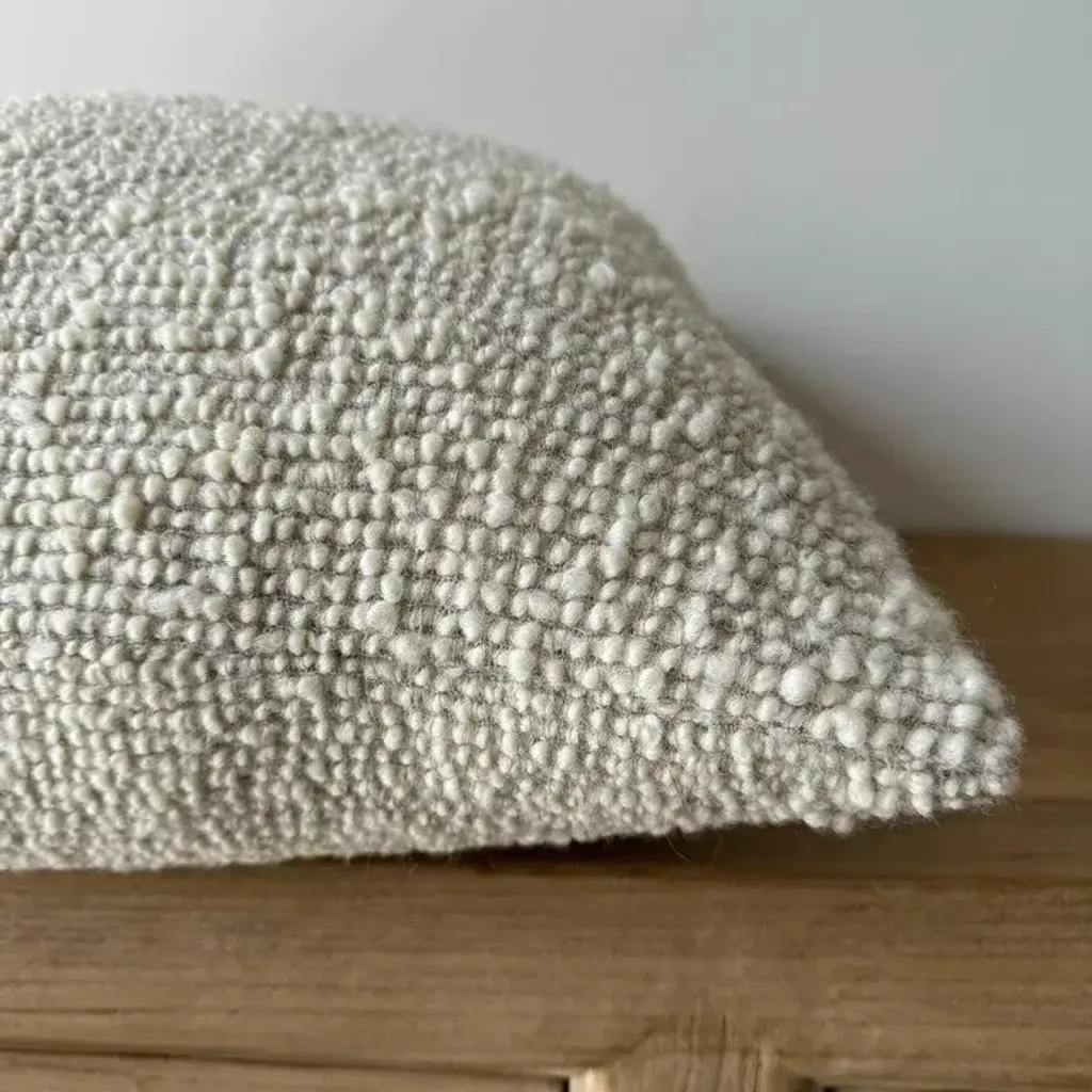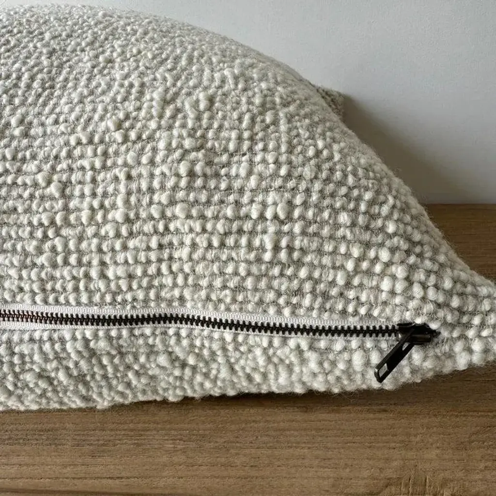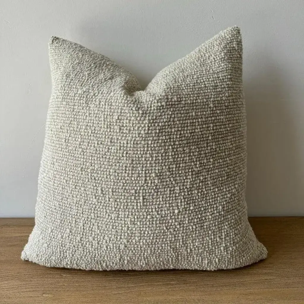 Oatmeal and natural flax wool and linen woven fibers in a stonewash finish create this luxurious soft pillow. Sewn with an antique brass zipper closure and overlocked edges. Includes Down/Feather Insert Size: 22 x 22. (custom sizes available) -20% Linen -55% Wool -8,2% PA ; 16%WP -500 gr/m2 -18.7 oz/yd2 -shrinkage 3% Care: Dry Clean Recommended. Spot cleaning ok. Can be washed in delicate cold cycle, lay flat to dry. Fabric origin: Belgium Made in the USA