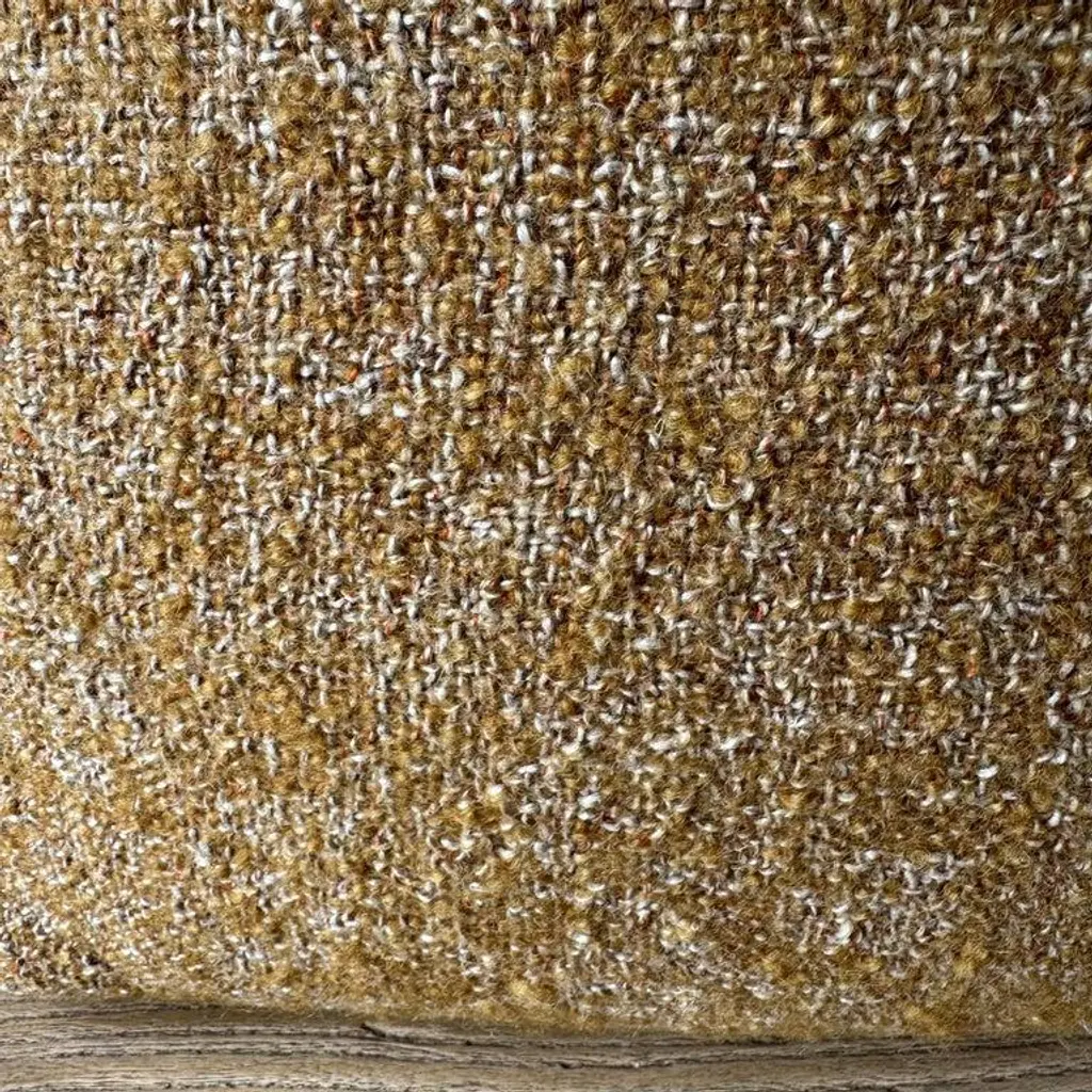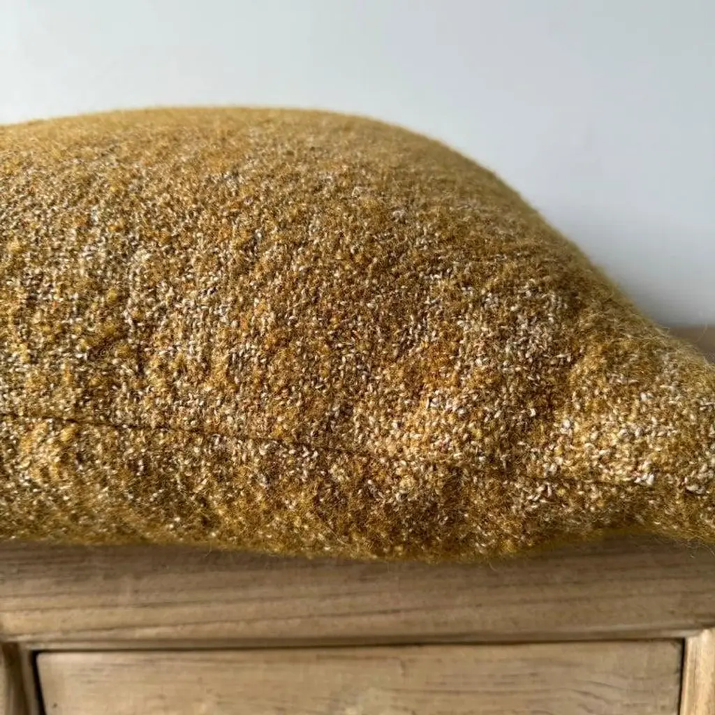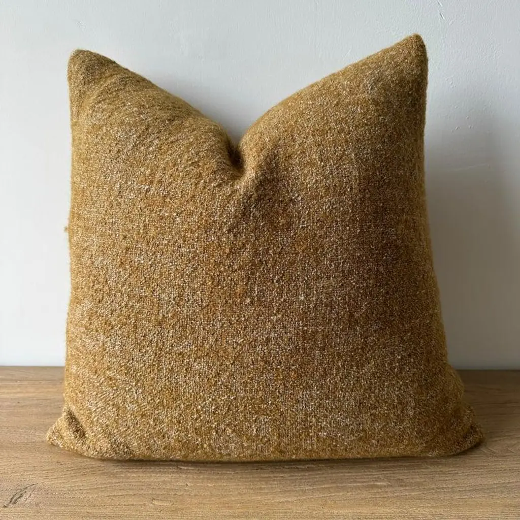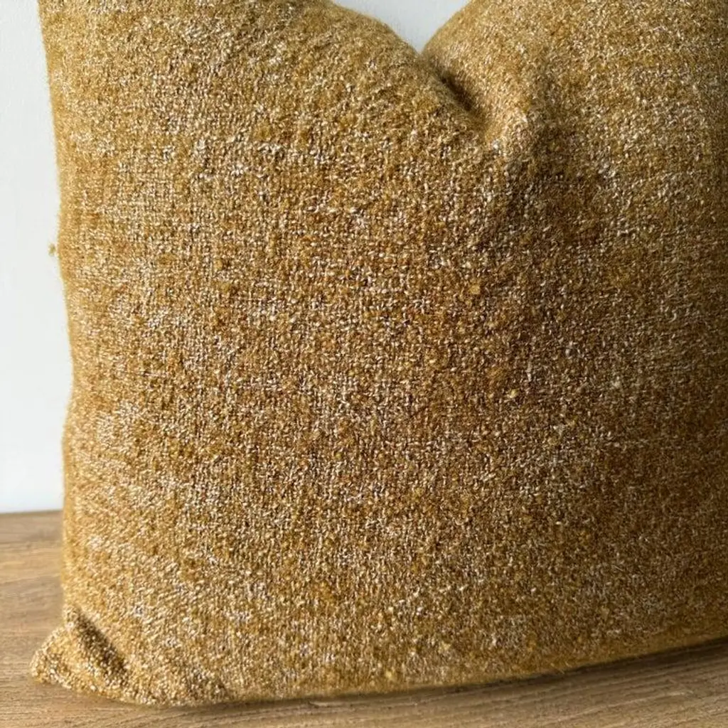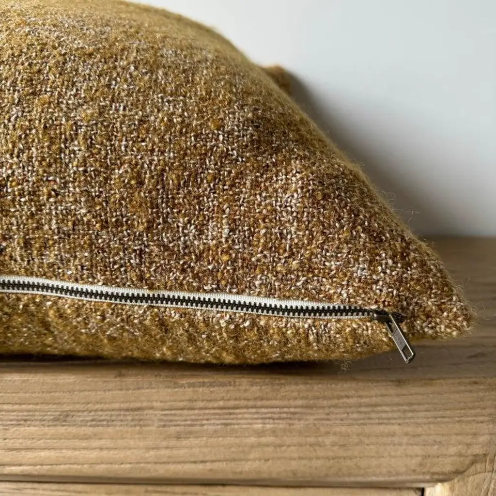 A rich dijon mustard, with hints of rust and natural flax oatmeal woven fibers in a stonewash finish create this luxurious soft pillow. Sewn with an antique brass zipper closure and overlocked edges. Includes a down/ feather insert. Size: 22 x 22 -51% Linen -39% Wool -10% PA -500 gr/m2 -14.7 oz/yd2 -shrinkage 3% Care: Dry Clean Recommended. Spot cleaning ok. Can be washed in delicate cold cycle, lay flat to dry. Fabric origin: Belgium Made in the USA