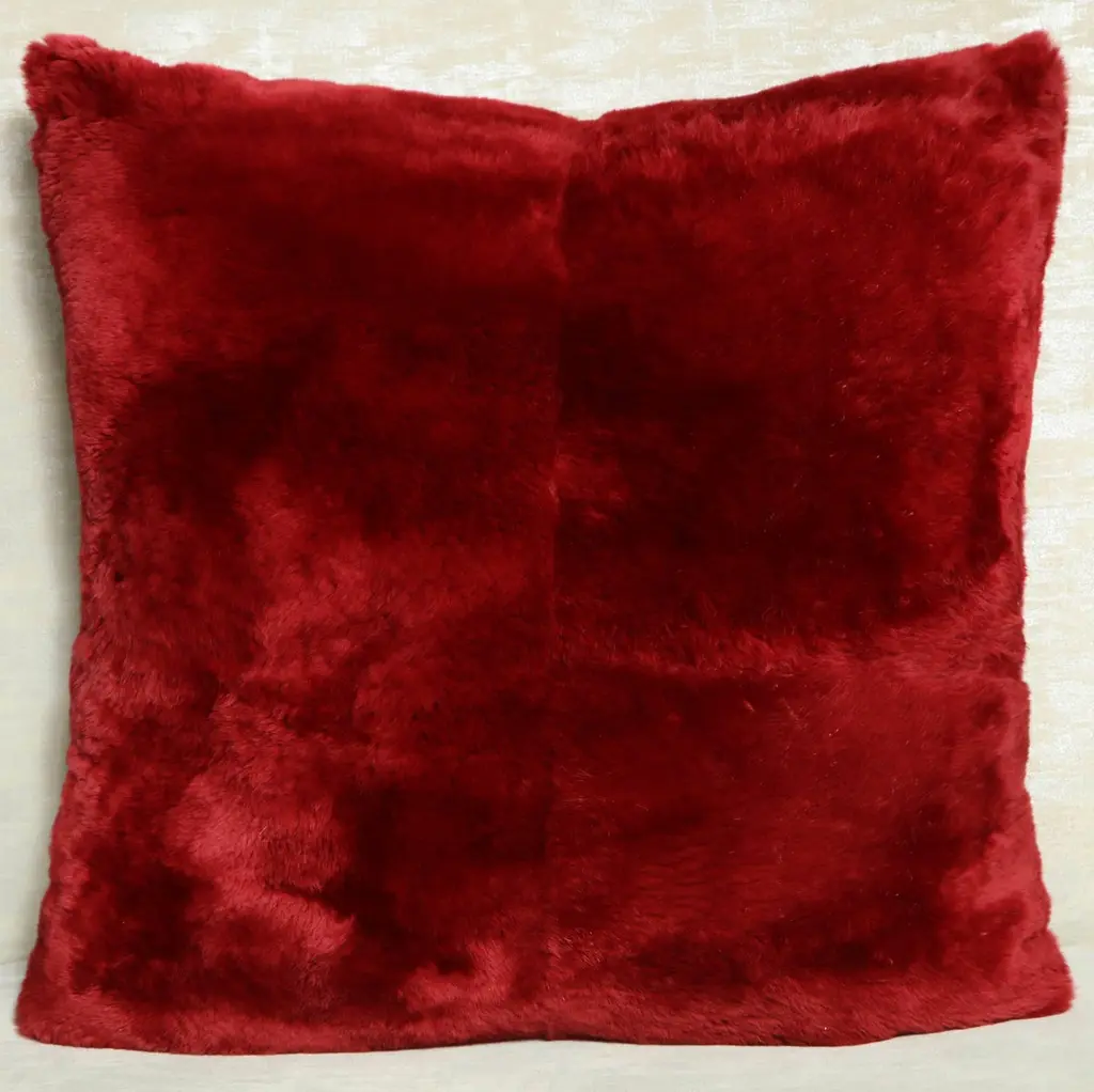 Custom 20" square red genuine sheared beaver pillow. Custom orders are available for different sizes and colors.