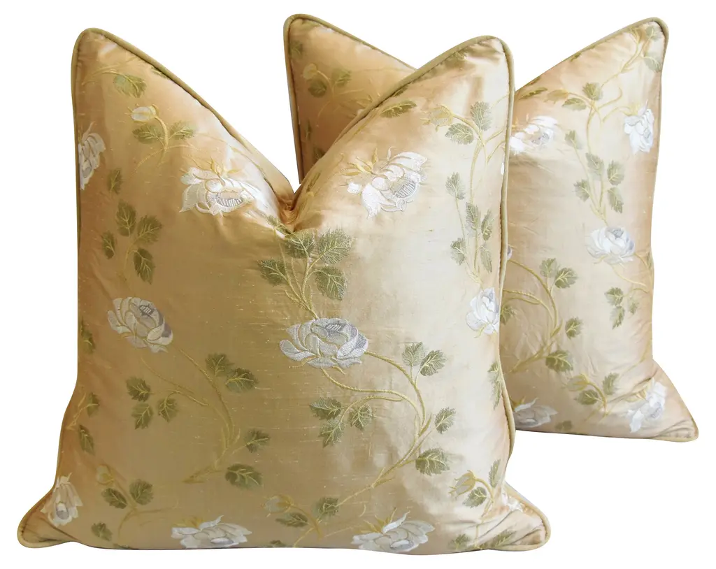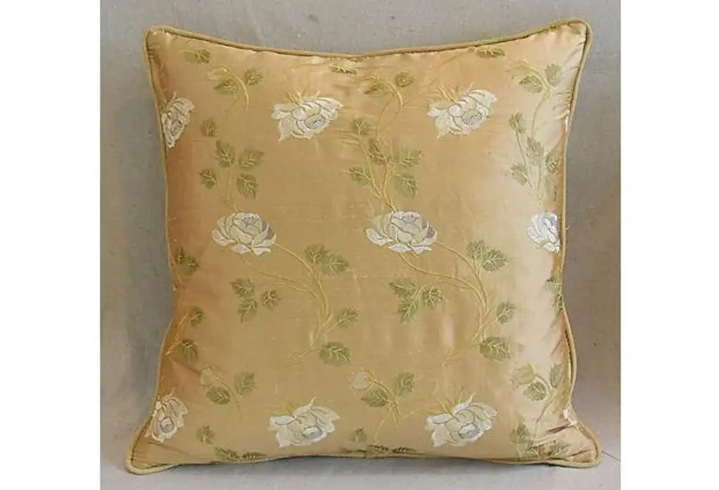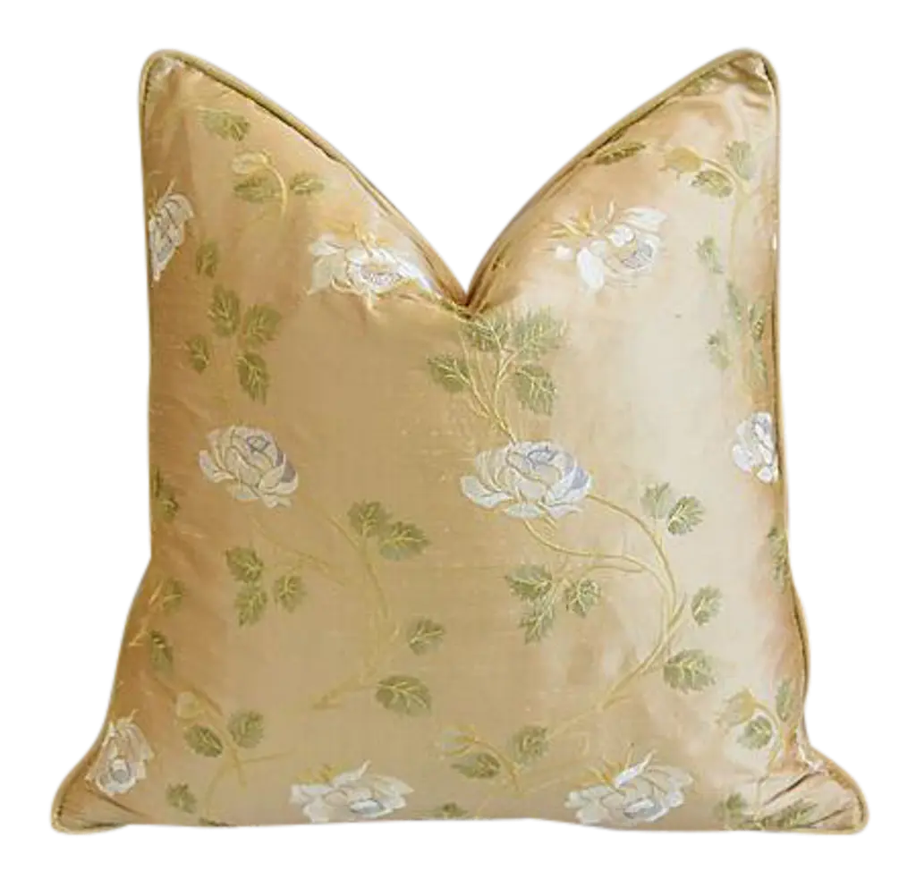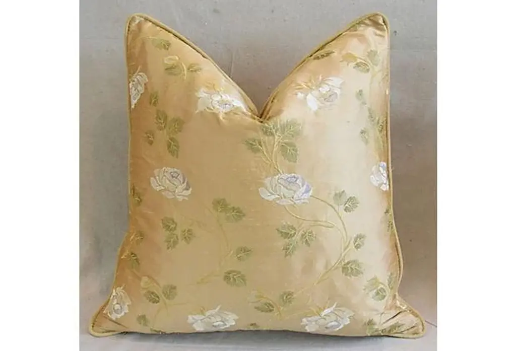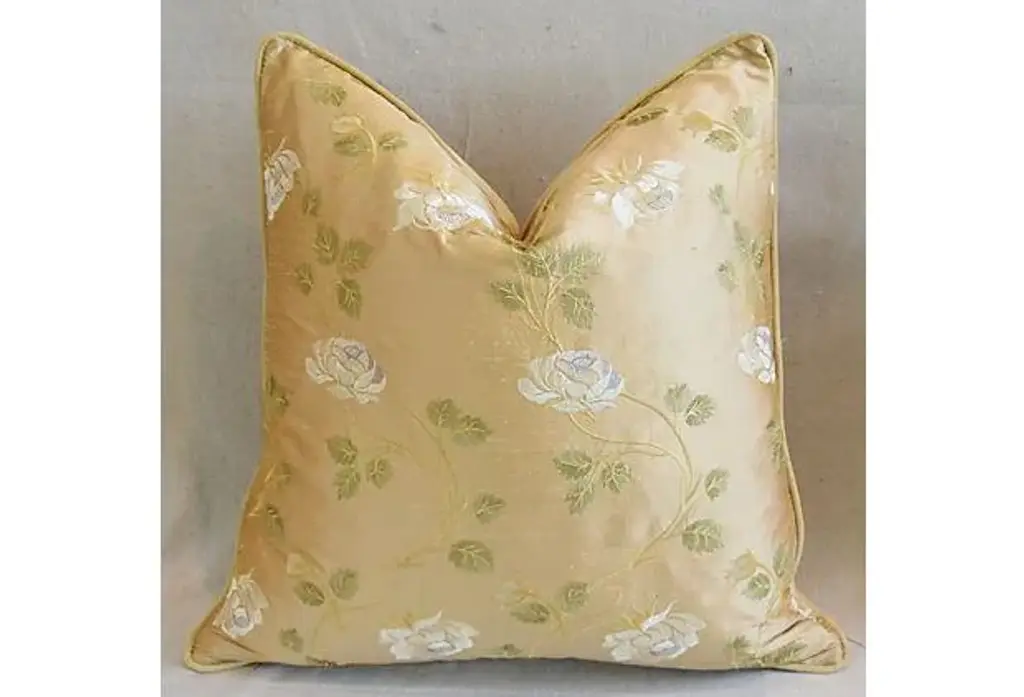 Large custom-tailored pillow created from vintage/never used designer cotton and silk blended fabric from England depicting a beautiful trailing white rose motif on a golden tan raw silk background. Pillow back is a gold cotton-velvet fabric. Pillow is accented with custom velvet cord trim, invisible zipper closure, and a new generous plump goose down-and-feather insert. Excellent new/unused condition!! ***PLEASE NOTE: I will combine shipping whenever possible if you purchase multiple items from my shop. Warm regards, Mike Seratt ***Also don't forget to take a peek at my other current listings...you just might find something you can't live without!!! It's easy just click on my name to the right of any listing highlighted in black "Mike Seratt of The Prized Pig" and presto it will bring you to my storefront!!! Cheers!!! Mike Seratt I SHIP OUT IMMEDIATELY, SO THE ESTIMATION YOU SEE FOR THE DELIVERY TIMELINE IS CHAIRISH'S OVERALL GENERAL TIMELINE, BUT I WILL GET THIS OUT THE NEXT DAY AND DELIVERY IS USUALLY 5-7 DAYS AT MOST