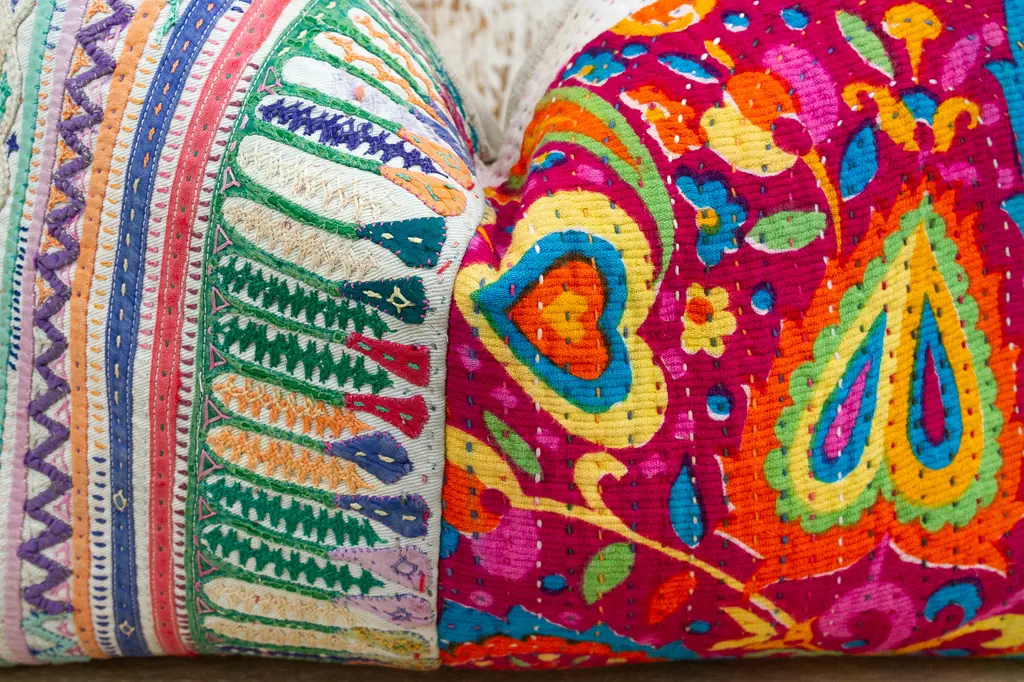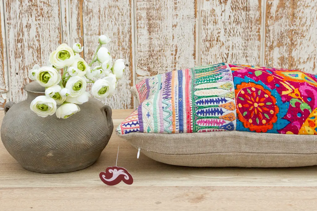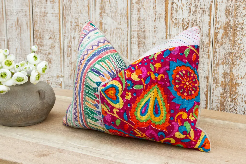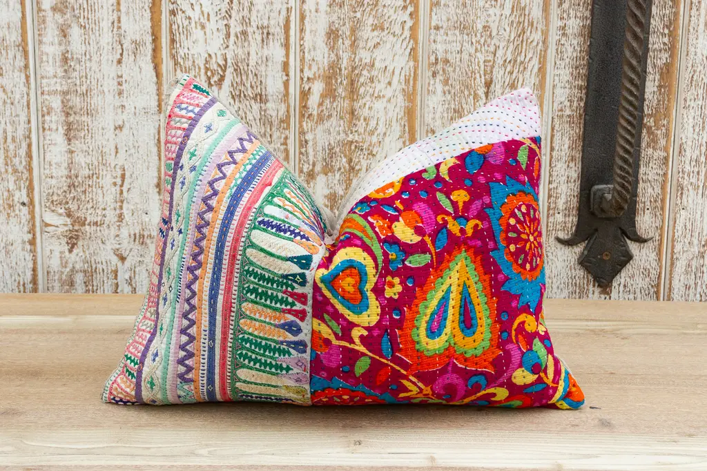 These colorful throw pillows are made from Rabari tribal dowry bags. The embroidery is on cotton and has intricate chain stitch of embellished patterns, motifs of flowers, peacocks and other tribal designs. These antique textiles have been made into pillows and are truly one-of-kind decorative pillows. Each pillow is backed with linen, has a zipper closure and a down blend insert is included.