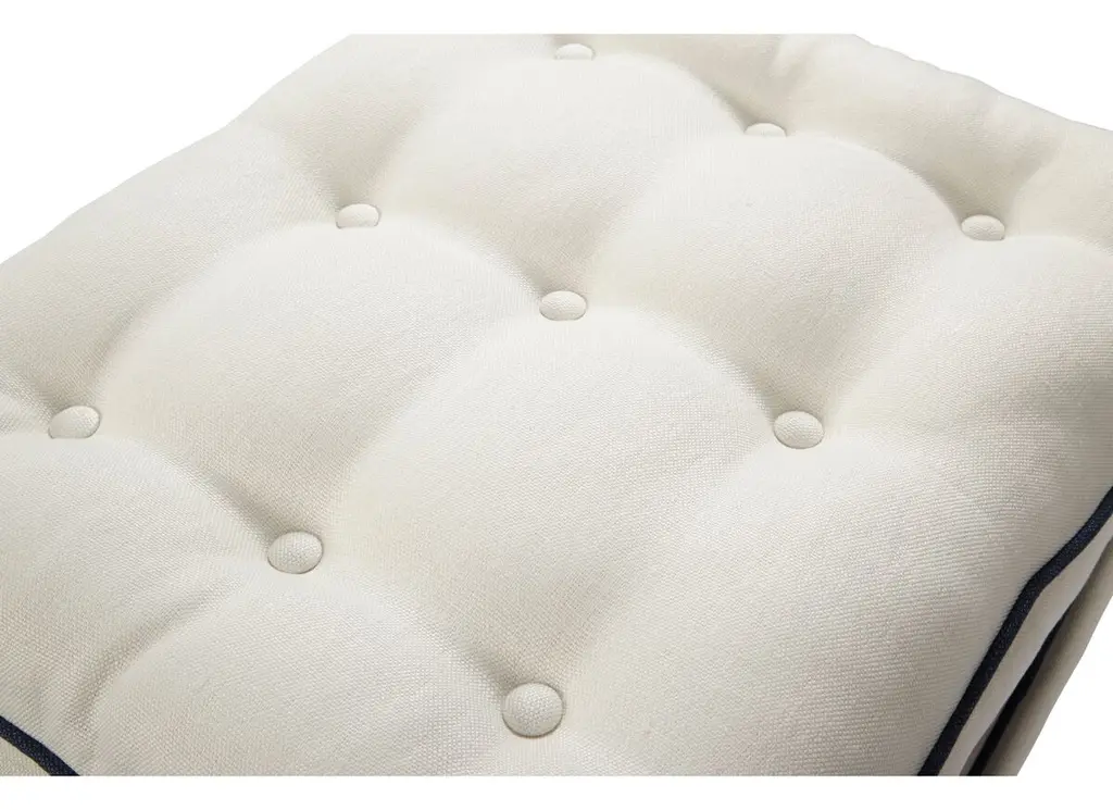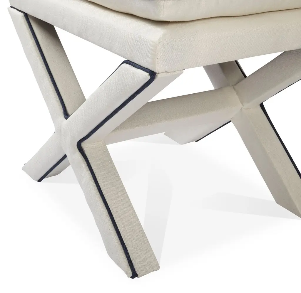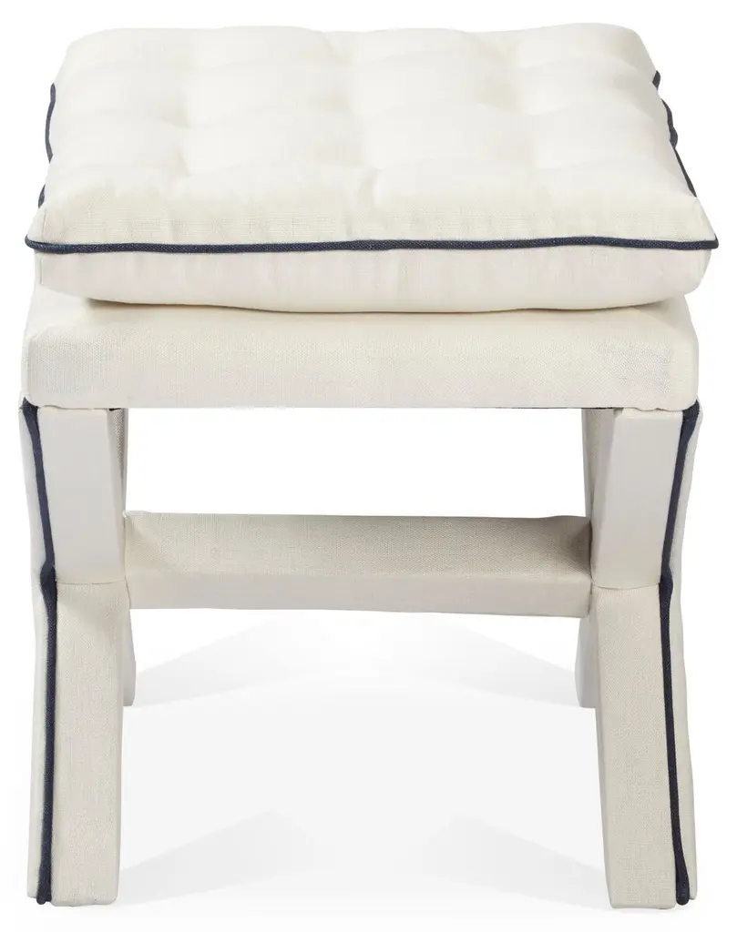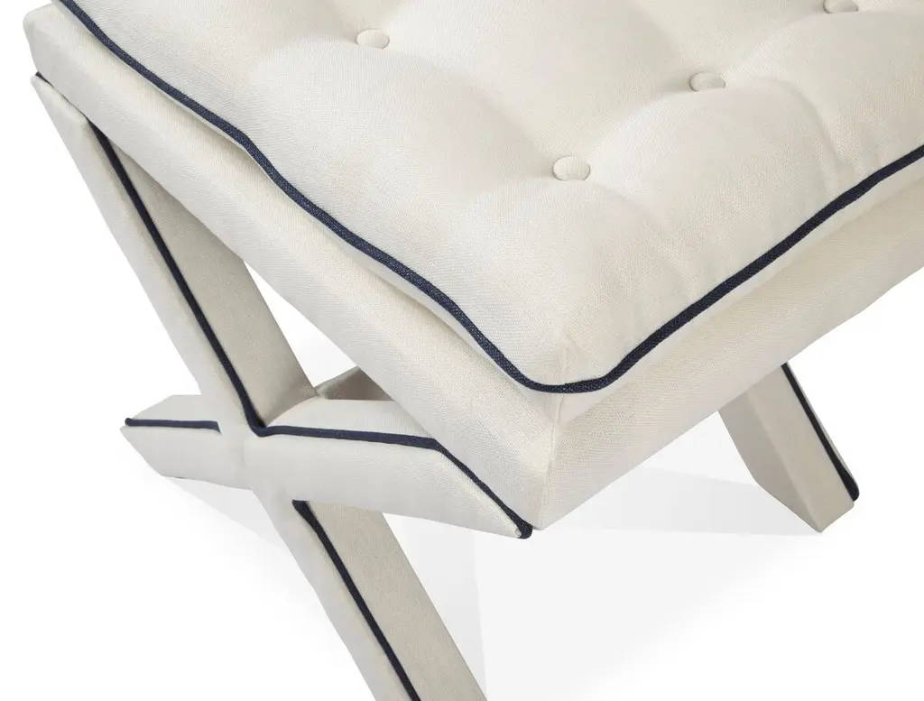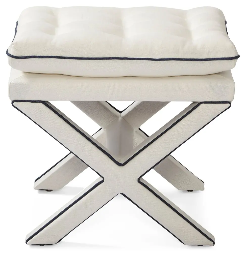Designed by us and available only at One Kings Lane: This luxe ottoman features an X-shaped base and a button-tufted pillow top that's generously filled with down-wrapped foam with a cotton-duck core. Its classic white linen upholstery is detailed with navy contrast piping. Made in the USA.