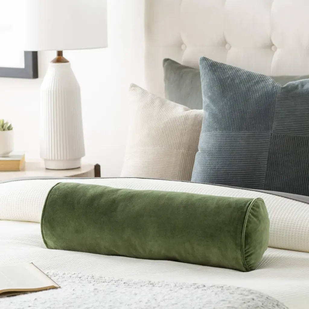 Shape + texture. This cylindrical bolster pillow adds dimension with piped edging and a clean silhouette. The 100% cotton cover offers a soft, tactile finish and comes in a range of colors—from bold blue or green to neutral ivory or charcoal. Stain-resistant and durable, it’s designed for everyday use. Available with or without a plush polyester insert. A versatile accent for beds, sofas, or reading nooks.