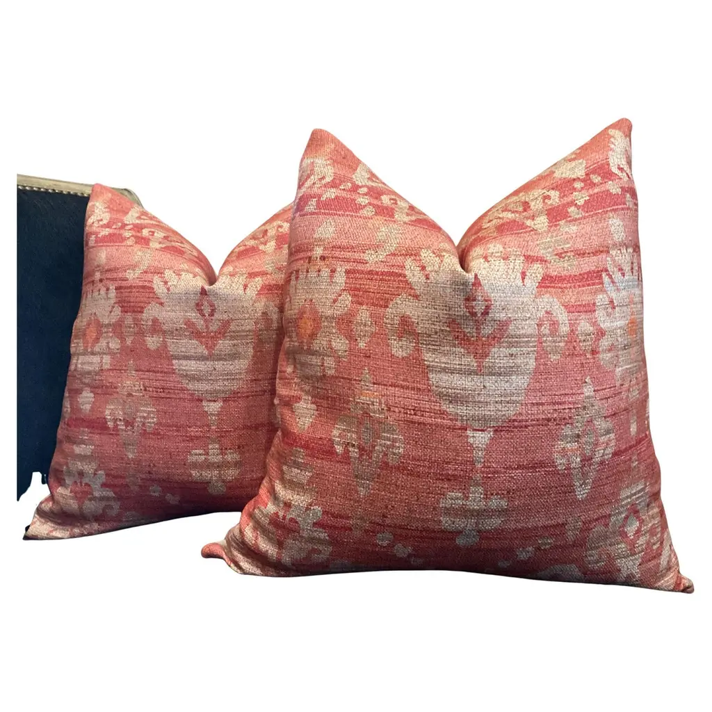 In celebration of Chairish's 10th Anniversary, Elaine S. Pillows launched the Dedar Pillow Collection, exclusive to Chairish. Please note this listing is for a double-sided pillow with fabric on front and back. We have single-sided pillows also available in our shop. Stunning weave. Schwarzwald from Dedar in Automne (Autumn) depicts swirling shades of soft gold, tans, soft tan, green and brown on cinnamon background. Done in a heavy linen reminiscent of tapestry. Or to use their words- “A linen fabric, whose pictorial personality is defined by the printed reproduction of a 17th century design, which transforms into a contemporary tapestry to revive one of the noblest forms of the textile tradition, thanks to a modern-day sensitivity.” This listing is for a pair of 18” down filled pillows featuring the lovely Dedar Schwarzwald on the front and back. Closure will be by way of invisible zipper.