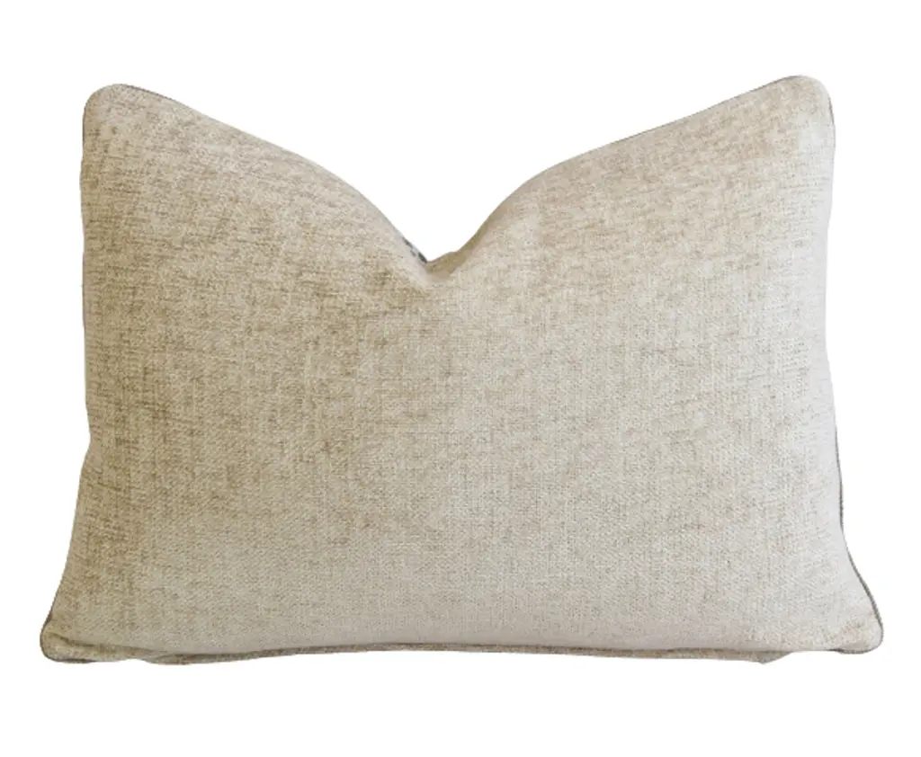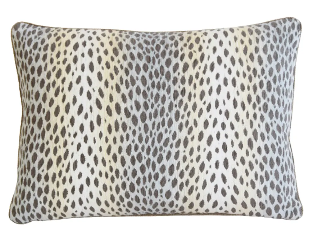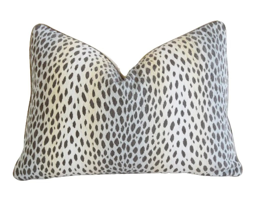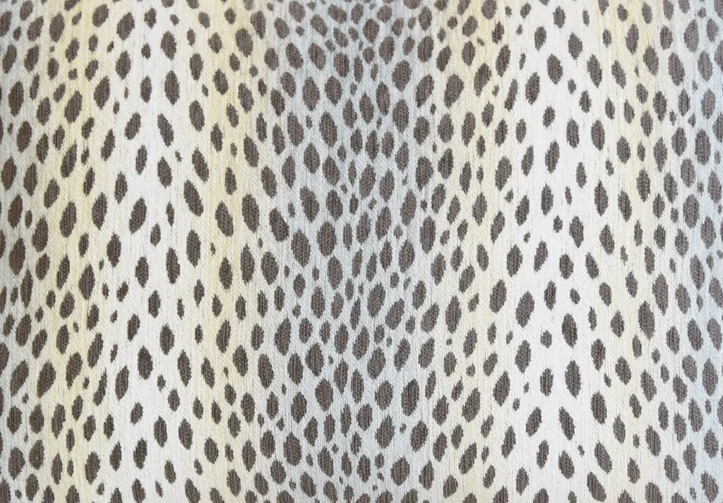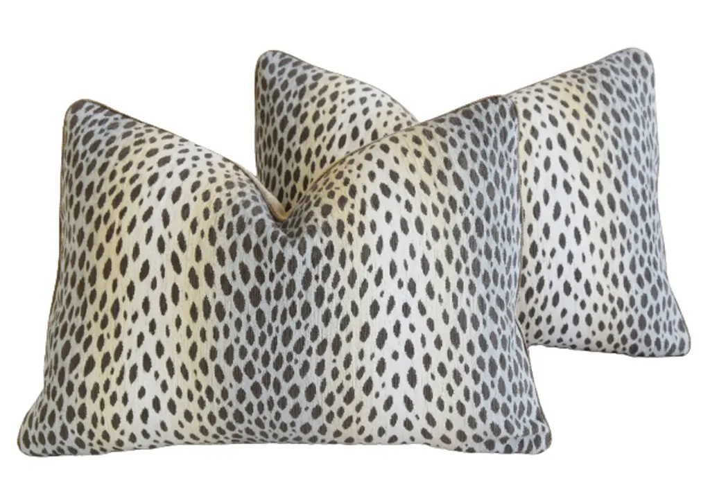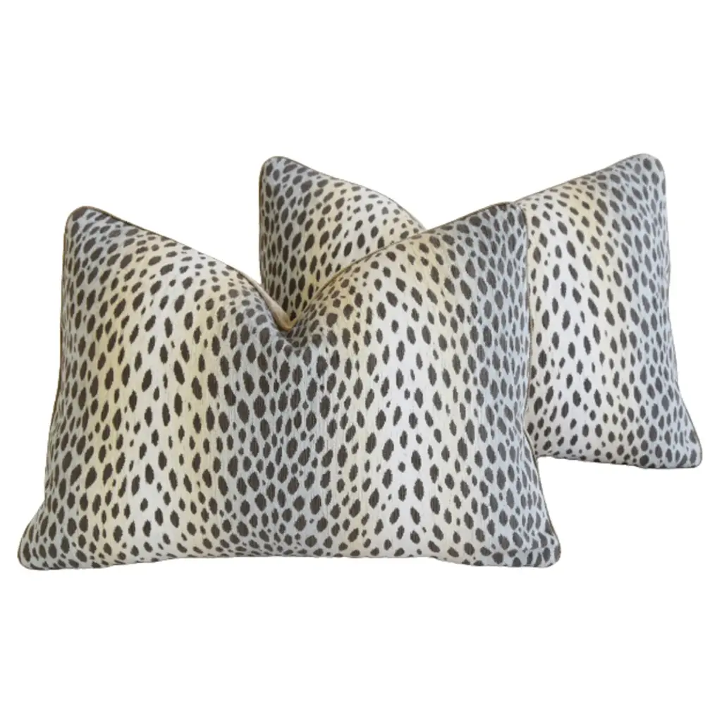 Pair of custom-tailored designer pillows in Duralee Fabrics woven luxurious cotton chenille fabric depicting a stunning animal antelope spot design. Tan cotton-chenille fabric backs. Custom cord trim. Zipper closures. New goose down-and-feather inserts. Excellent new unused condition.