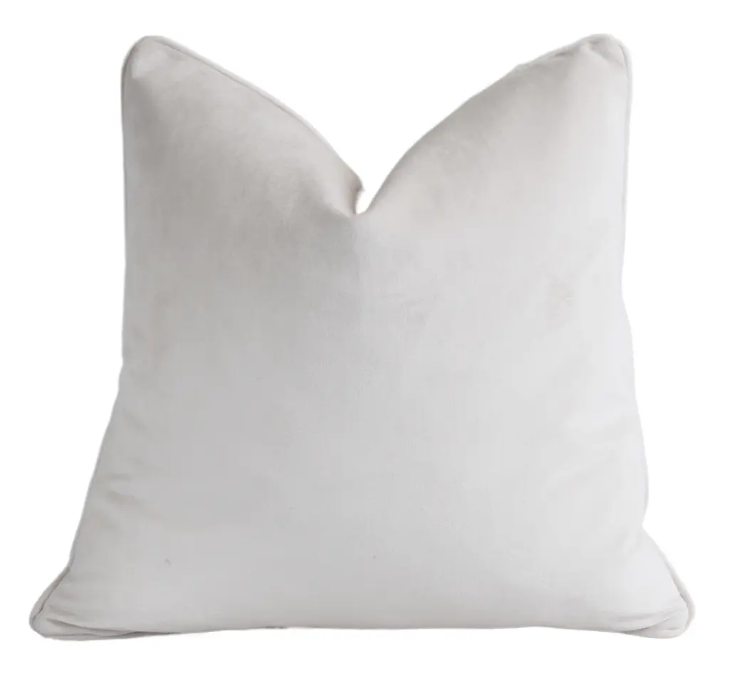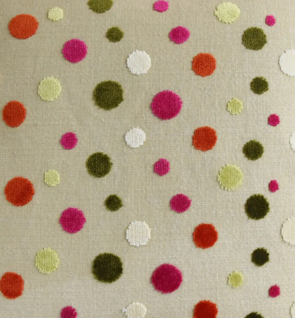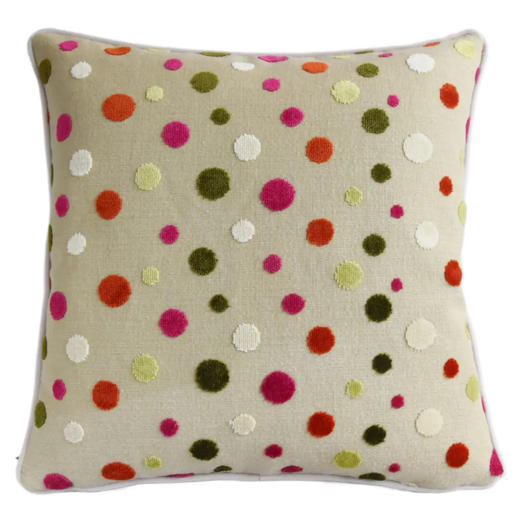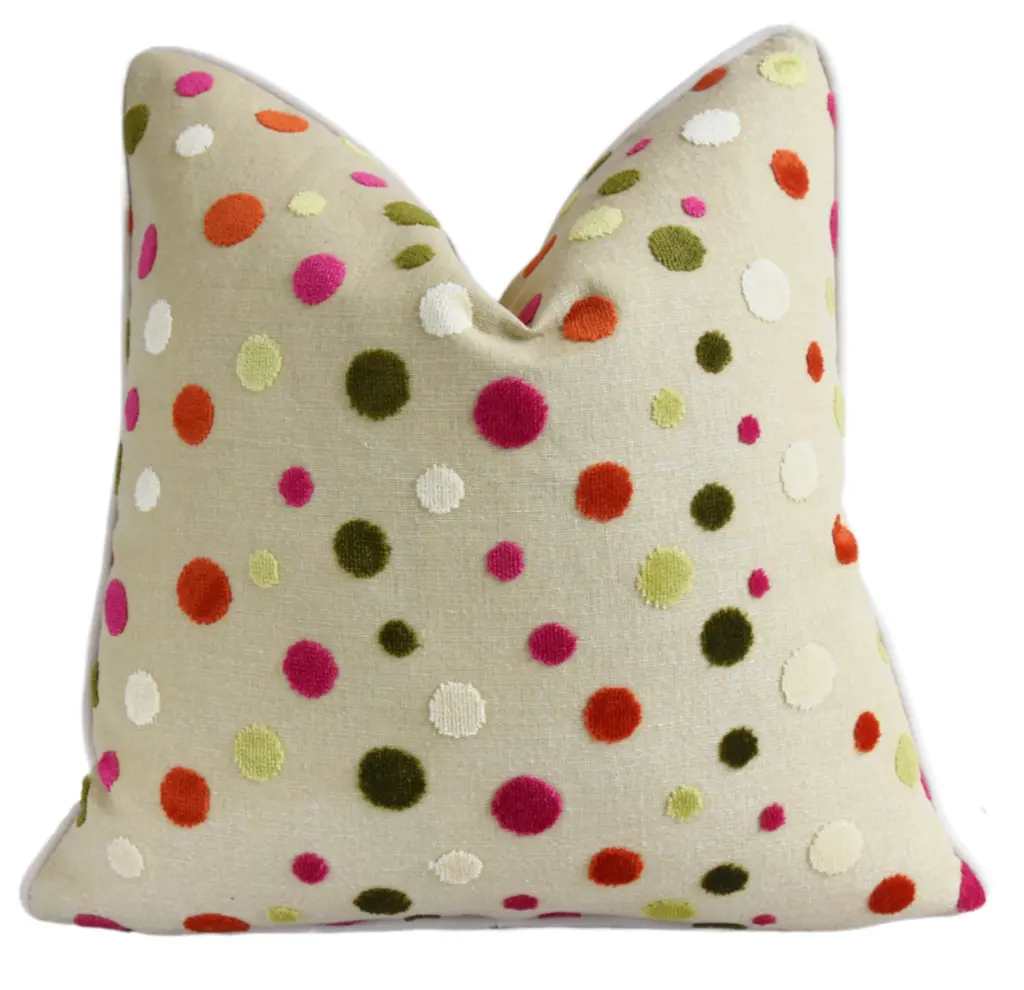 Custom-tailored pillow in a designer cut velvet fabric depicting multicolored velvet circles or dots. Cream-colored cotton-velvet fabric back. Custom cord trim. Zipper closure. New plump goose down-and-feather insert. Excellent new unused condition.