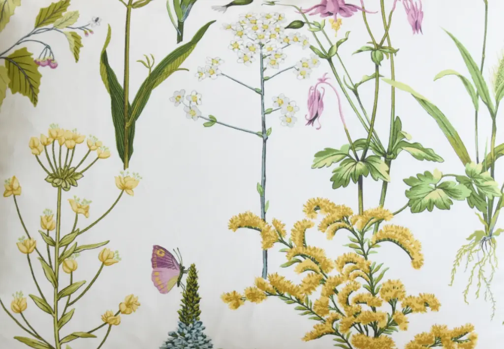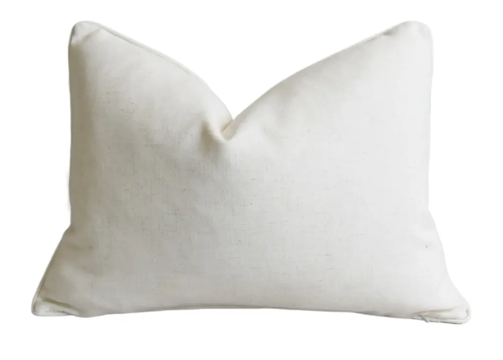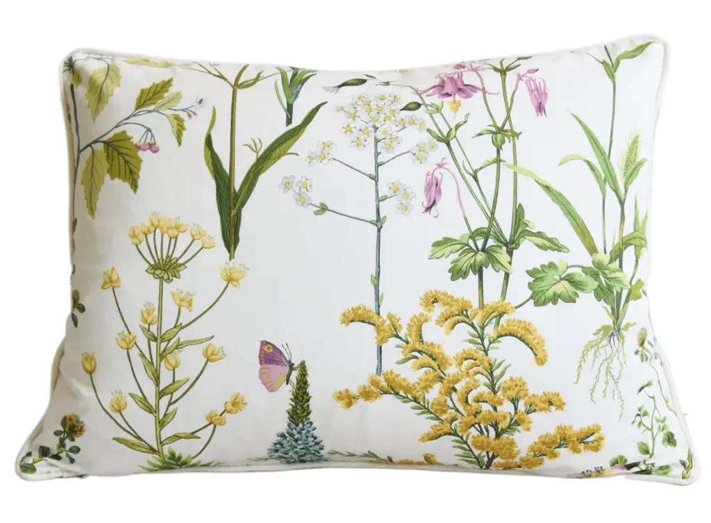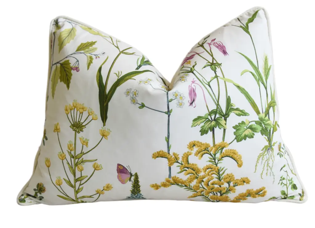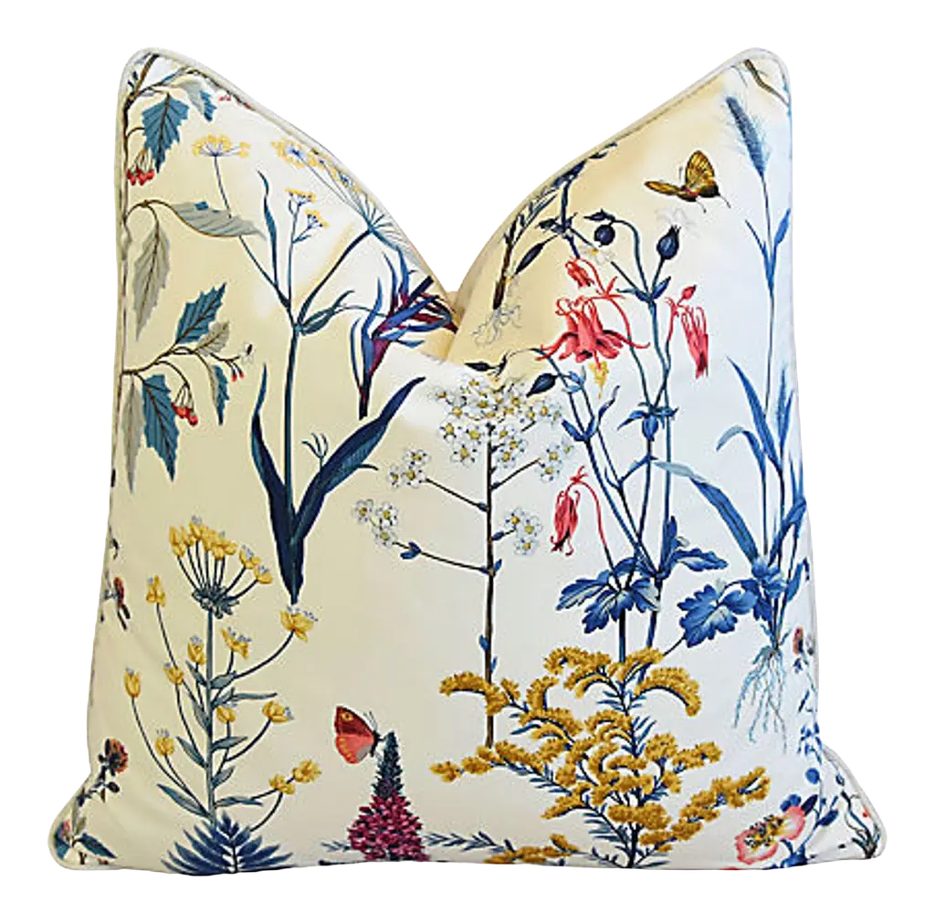 Custom-tailored pillow in a cotton wildflower print fabric. Off-white linen fabric back. Custom-tailored linen cord trim. Hidden zipper closure. New plump goose down-and-feather insert. Excellent new unused perfect condition!!!!