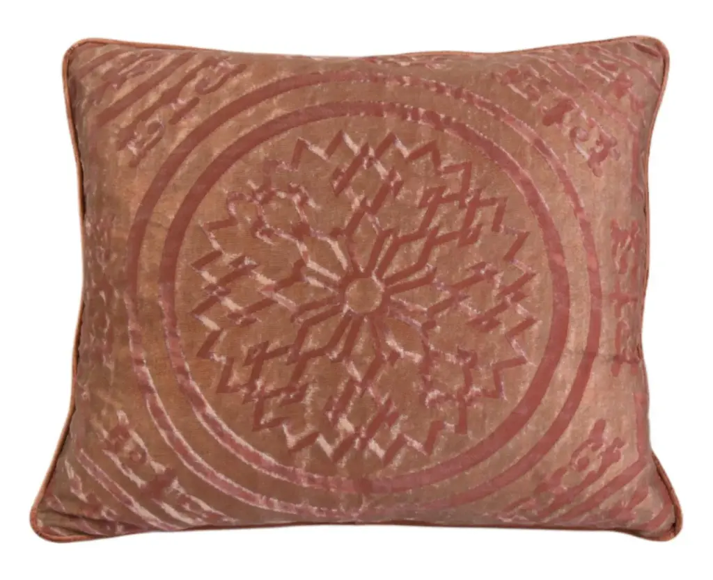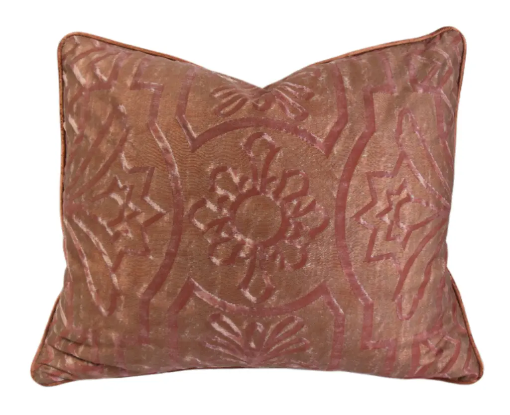 Custom-tailored pillow by Mike Seratt of The Prized Pig in Italian Mariano Fortuny cotton fabric called "Altare" in their Fior di pesco & copper colorway. Inspired by the inlaid marble steps that lead to the altar of the church of Santa Maria Assunta. Complementary silk velvet fabric back. Custom cord trim. Zipper closure. Generous goose down/feather insert. All pillows in this listing have identical pattern placement on the front. Excellent new, unused condition!! ***I will combine shipping whenever possible if you purchase multiple items from my shop. ***Also, don't forget to peek at my other current listings...you might find something you can't live without!!! It's easy. Just click on my name to the right of any listing highlighted in black, "Mike Seratt of The Prized Pig," and presto, it will bring you to my storefront!!! Cheers!!! Mike Seratt I SHIP OUT IMMEDIATELY, SO THE ESTIMATION YOU SEE FOR THE DELIVERY TIMELINE IS CHAIRISH'S OVERALL GENERAL TIMELINE, BUT I WILL GET THIS OUT THE NEXT DAY AND DELIVERY IS USUALLY 5-7 DAYS AT MOST