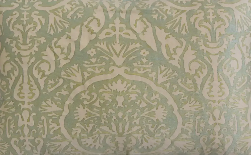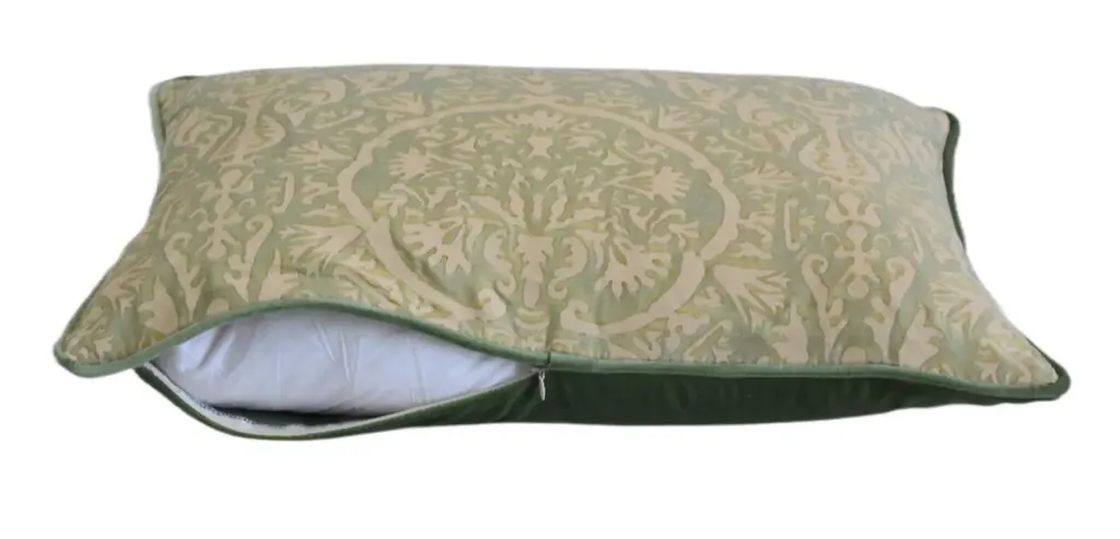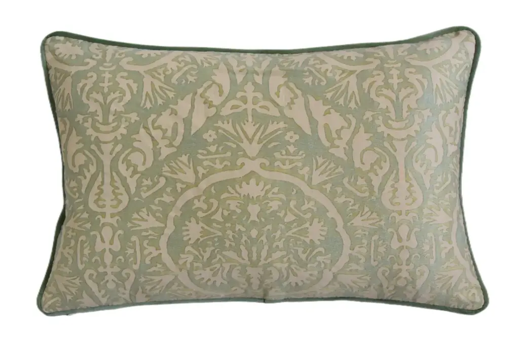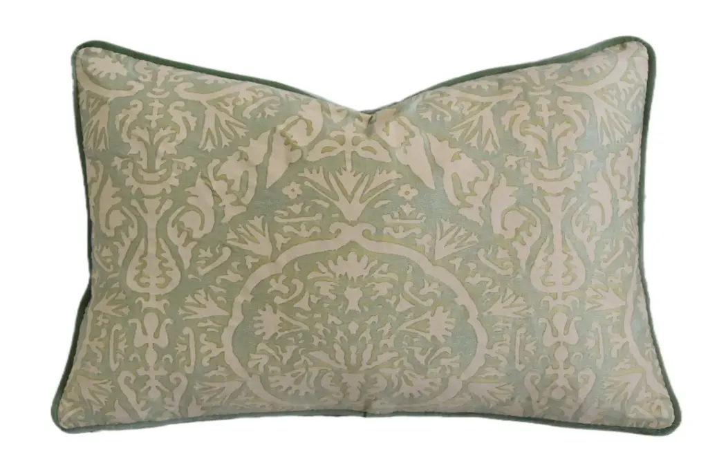Custom-tailored pillow by Mike Seratt of The Prized Pig in Italian Venetian Mariano Fortuny cotton fabric called "Piazzetta" in a celadon green and beige colorway. Named after the Venetian Rococo painter Giovanni Battista Piazzetta. Complementary cotton velvet back. Custom cord trim. Hidden zipper closure. Plump, generous down/feather insert. All pillows in this listing have identical pattern placement. Excellent new, unused, beautiful condition!! ***PLEASE NOTE: I will combine shipping whenever possible if you purchase multiple items from my shop. Warm regards, Mike Seratt ***Also, don't forget to take a look at my other current listings...you might find something you can't live without!!! It's easy. Just click on my name to the right of any listing highlighted in black, "Mike Seratt of The Prized Pig," and presto, it will bring you to my storefront!!! Cheers!!! Mike Seratt I SHIP OUT IMMEDIATELY, SO THE ESTIMATION YOU SEE FOR THE DELIVERY TIMELINE IS CHAIRISH'S OVERALL GENERAL TIMELINE, BUT I WILL GET THIS OUT THE NEXT DAY AND DELIVERY IS USUALLY 5-7 DAYS AT MOST