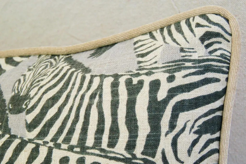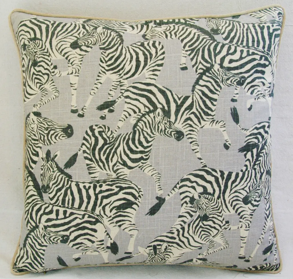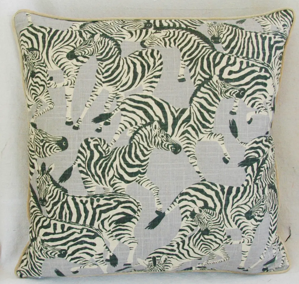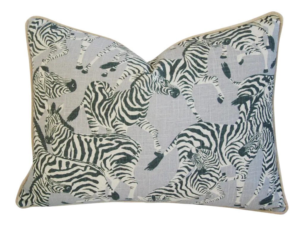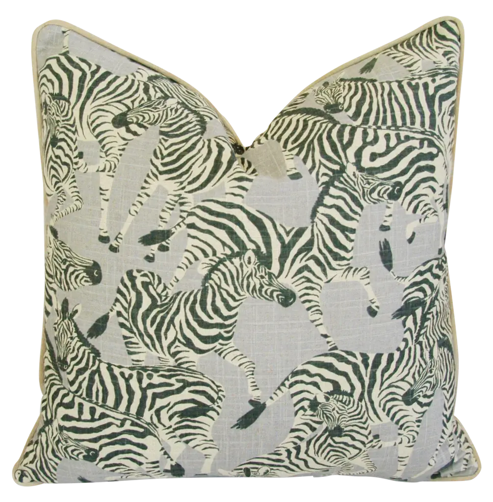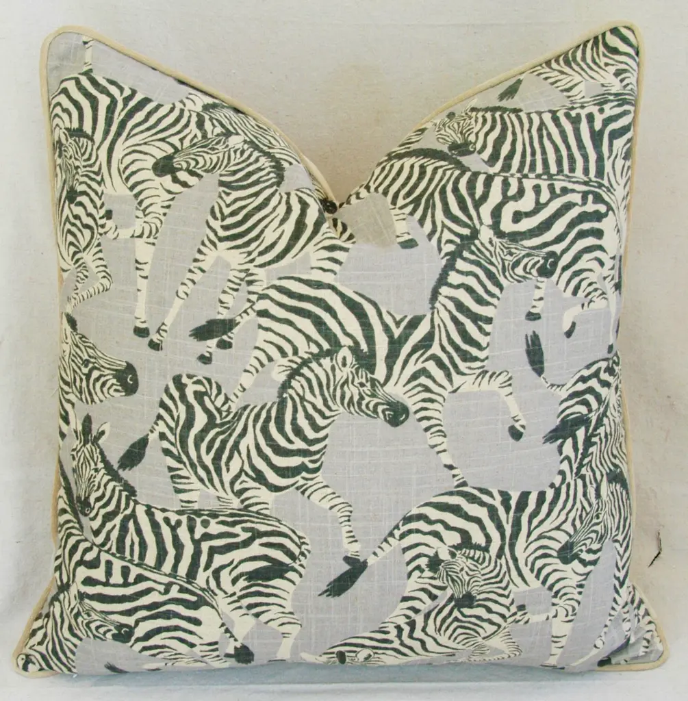 Large custom-made pillow in a vintage printed 100% linen fabric depicting a wonderful safari zebra motif. Sand-colored velvet fabric backs and matching cord trim. Invisible zipper closure and generous goose down-and-feather inserts. Excellent new unused condition!!!!! ***PLEASE NOTE: If you purchase more than one pillow or more than one pair of pillows you may initially be charged extra shipping costs at checkout. However, I always combine items into one box when possible and I will alert Chairish to refund any overage paid on shipping costs to you. Warm regards, Mike Seratt I SHIP OUT IMMEDIATELY, SO THE ESTIMATION YOU SEE FOR THE DELIVERY TIMELINE IS CHAIRISH'S OVERALL GENERAL TIMELINE, BUT I WILL GET THIS OUT THE NEXT DAY AND DELIVERY IS USUALLY 5-7 DAYS AT MOST