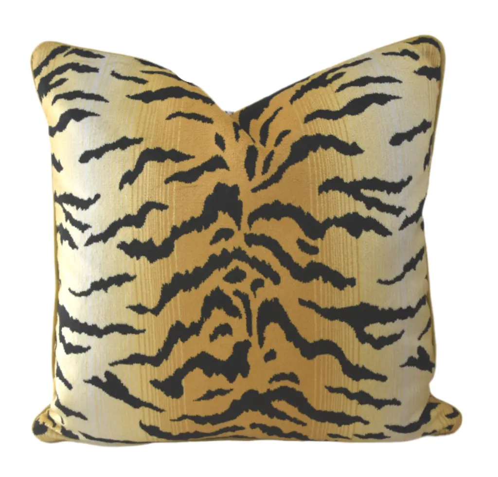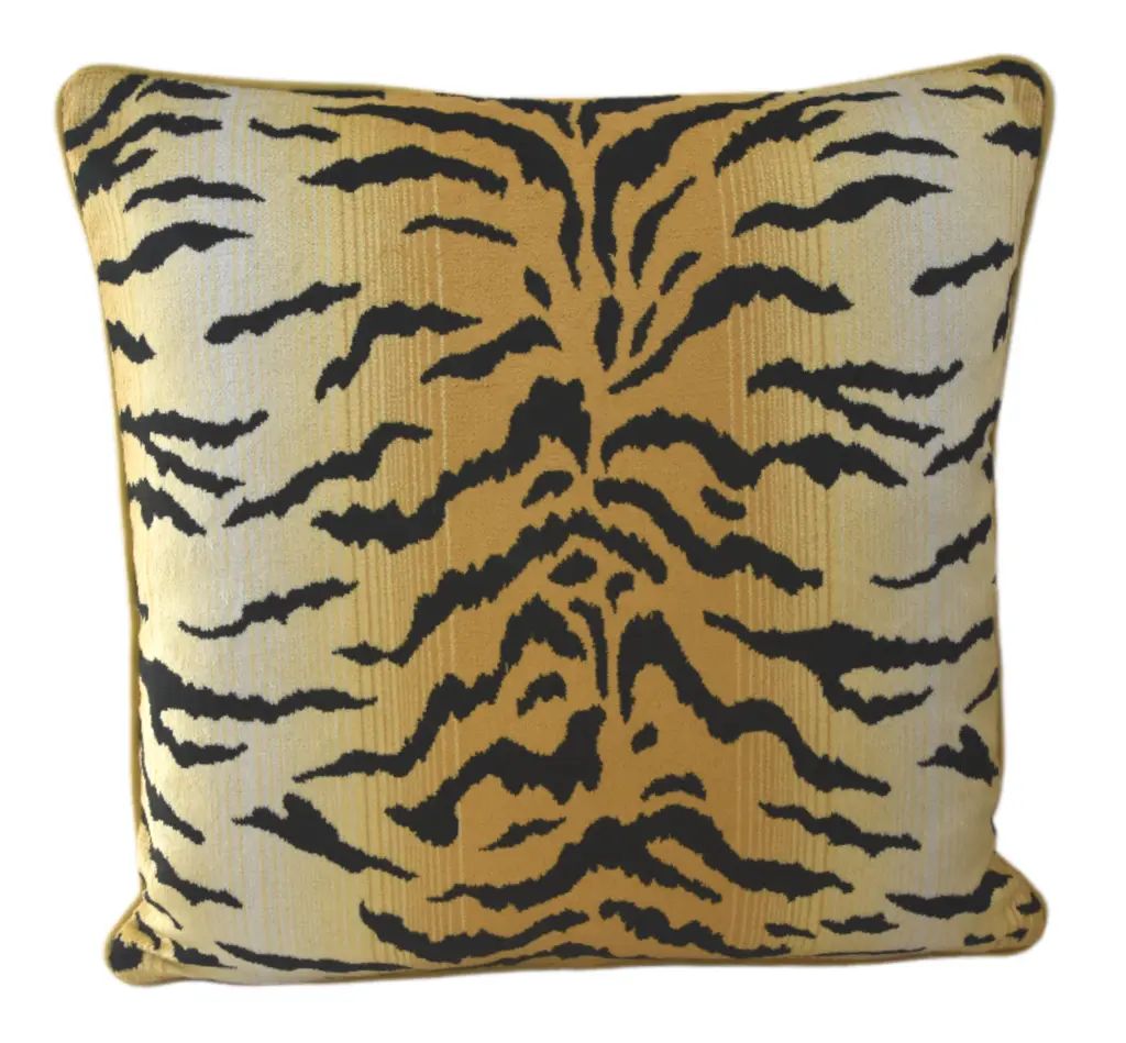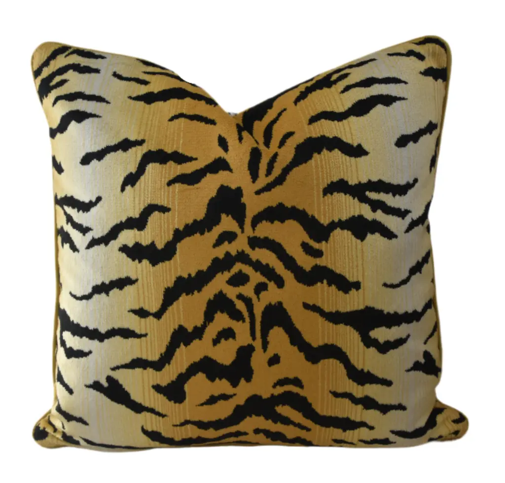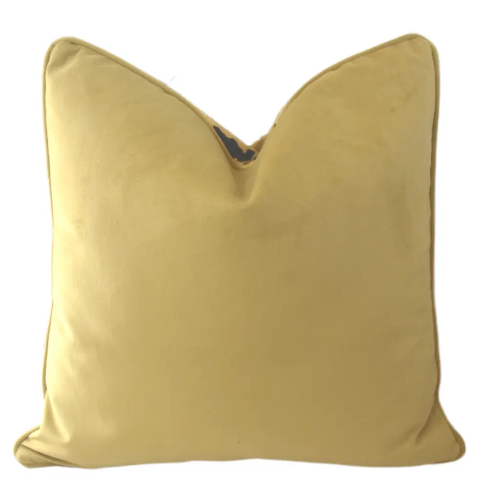 Custom-tailored pillow by Mike Seratt of The Prized Pig in Italian handloomed shimmering velvet fabric. Gold cotton-velvet back. Custom velvet cord trim. Invisible zipper closure. Generous plump goose feather and down insert. Excellent new unused condition!!!