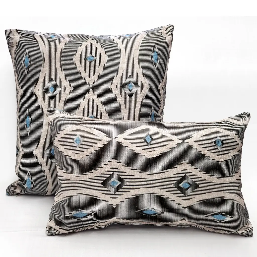 This intricate geometric pillow features a horizontal and vertical arrangement of thin lines that creates an alternating diamond and wave pattern. Small soft blue diamonds stand out like jewels giving this 19 Inch square pillow a modern and sophisticated flair. Size: 19"x19" Square Fabric: 100% Polyester Same fabric on front and back. Knife edge seams. Inside seams are serged for strength and durability. Hidden zipper closure in bottom seam of pillow cover Dry cleaning is recommended, or machine wash separately in cold water on delicate cycle. Lay flat to dry, iron inside out on low heat. Made in Canada: Designed and made in Pillow Decor's Vancouver workroom.