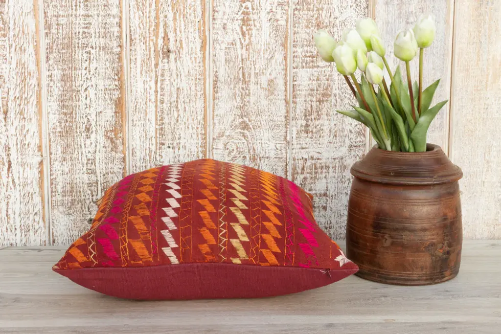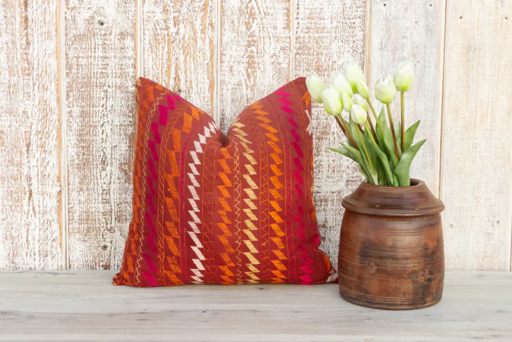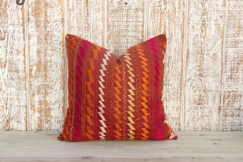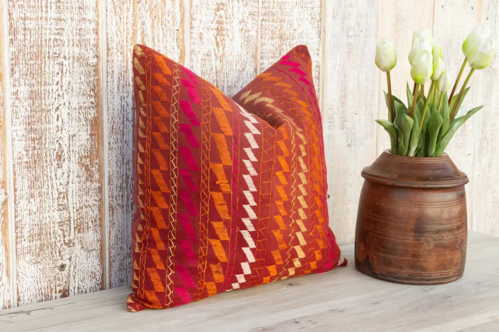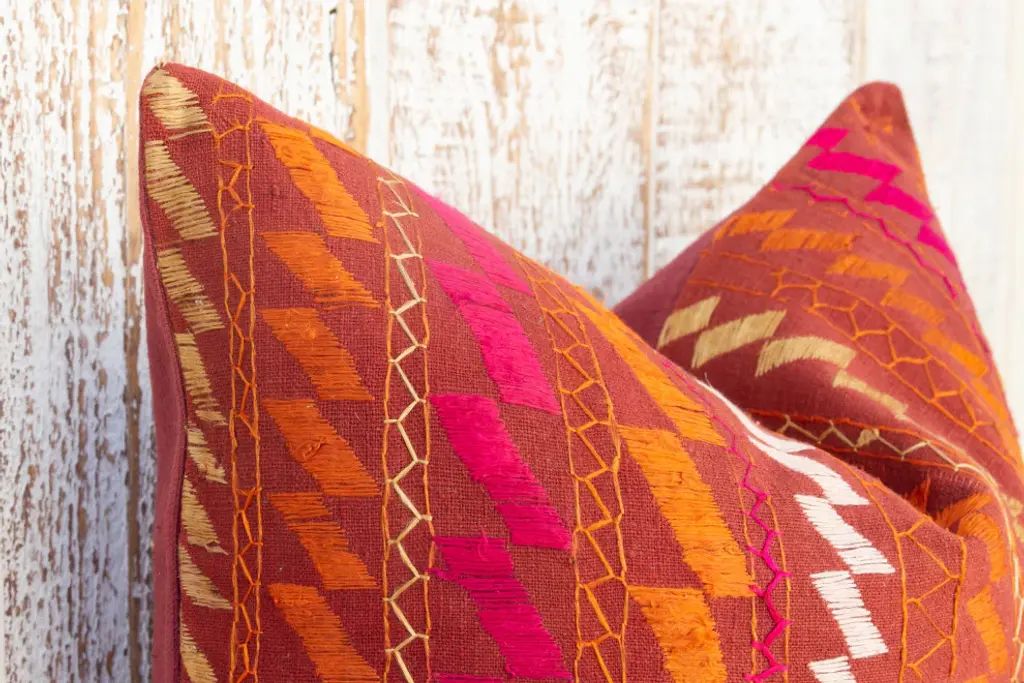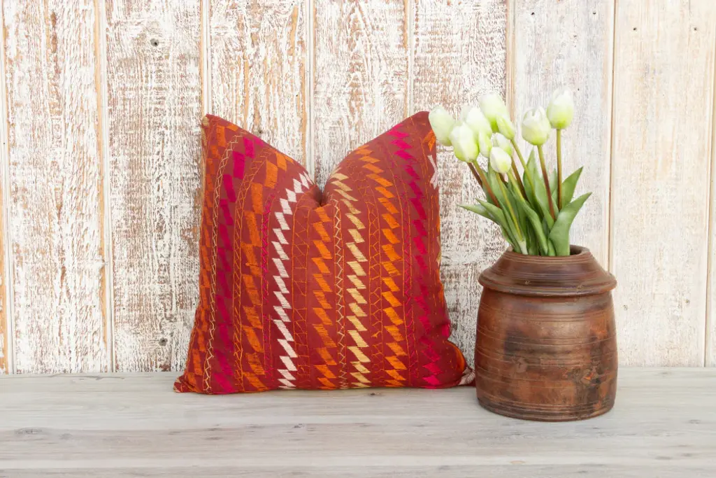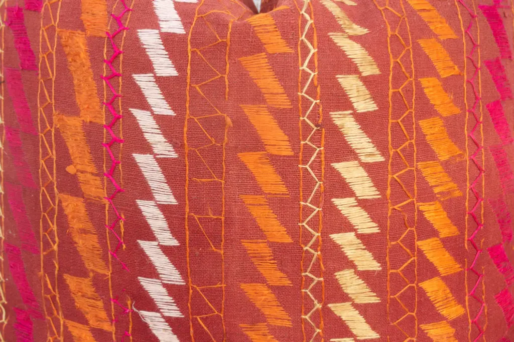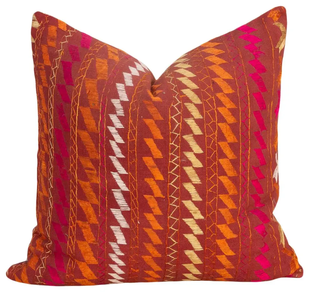 This colorful and luxurious Bagh Phulkari pillow features beautiful hand-done silk embroidery on top of a cotton fabric. Phulkari means "flower work" and is very descriptive of this vibrant, delicate pillow. Phulkari fabrics are often used in ceremonies concerning birth and marriage.Pillow has a hidden zipper and comes with a down filler.