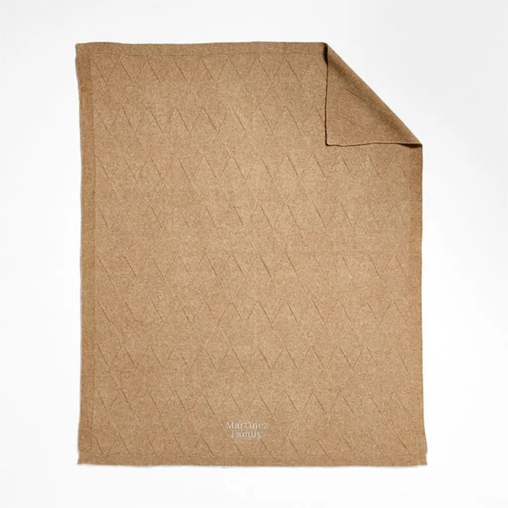 One of the softest blankets we've ever found, this throw lends indulgent coziness and subtle texture to sofas and chairs. Knit with a smaller gauge, the wool-blend blanket in camel tan features a neat diamond pattern and a two-inch ribbed hem for a sophisticated look. Our sensationally soft blanket makes a fabulous gift (perhaps to yourself), especially paired with the coordinating light brown throw pillow.