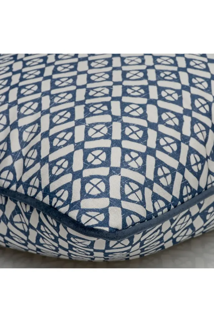 Designed in collaboration with Sophie Paterson this soft and plump cushion is an outdoor version of our classic Audley design. The stylish geometric diamond pattern is printed on smooth polyester material with a shower-resistant finish. This cushion will add sophistication to your outdoor living area.This outdoor cushion is printed on a polyester cloth with a shower-resistant finish which is also anti-mold, anti-mildew, and anti-microbial and has been filled with a hollow fiber pad. We do recommend, however, that these scatter cushions are looked after carefully and are best used in dry weather. As with most outdoor textiles, they prefer to be stored inside when they are not being used, or during periods of wet, cold, or damp weather. - Blue