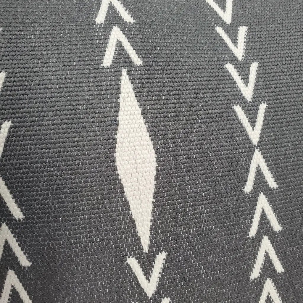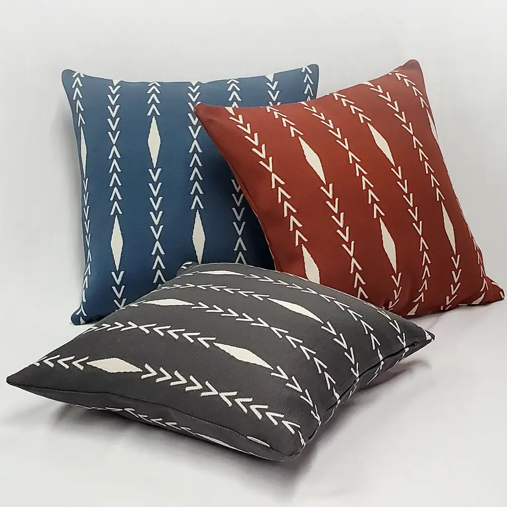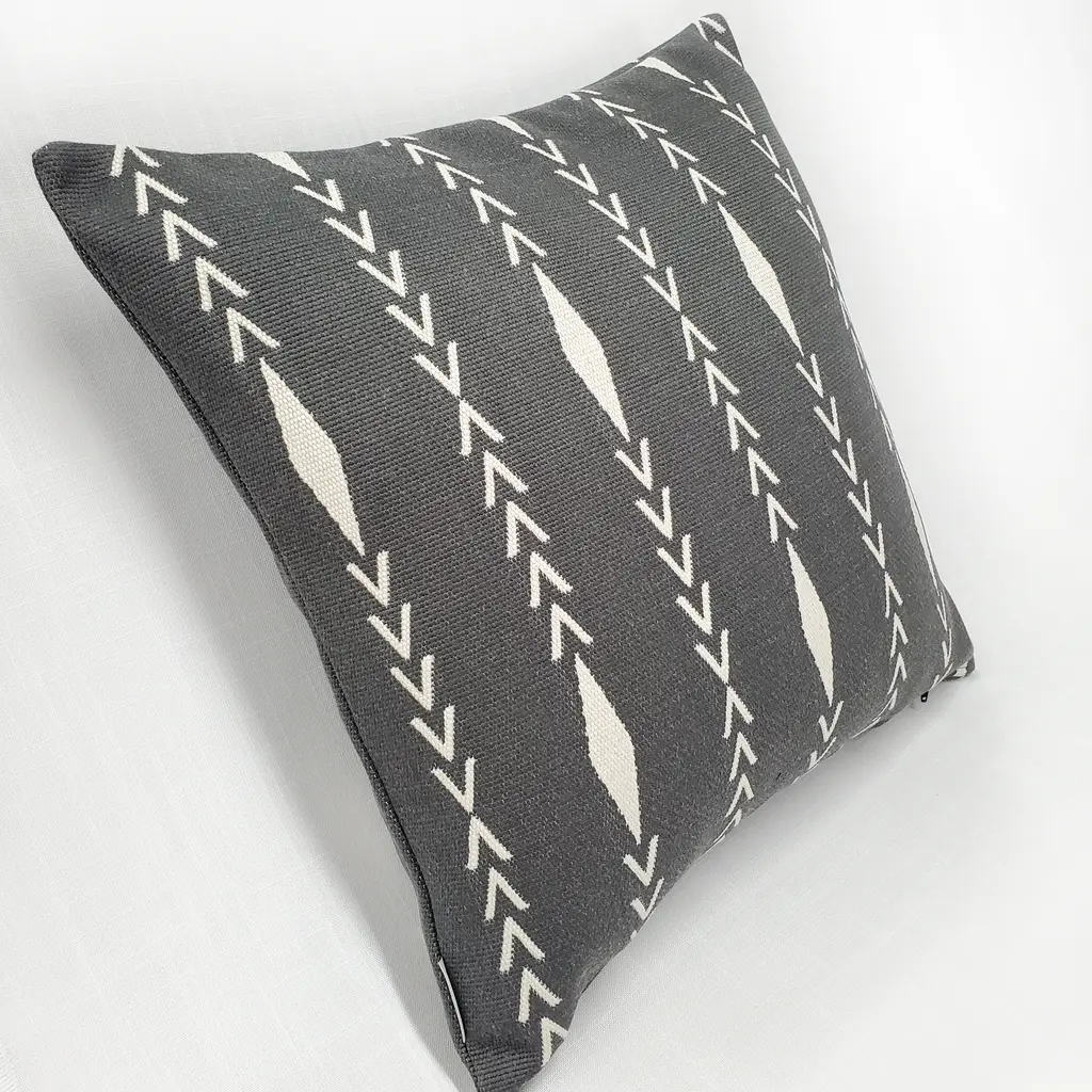 The Diamond Ray Charcoal Gray Throw Pillows are made from a sturdy yet exceptionally soft woven fabric. The bold graphite gray color of this pillow is in beautiful contrast with the creamy, off-white diamond and v-shaped linear pattern. With its clean geometric pattern and soft, durable fabric, the 20-inch square Diamond Ray Charcoal Gray Throw Pillow is suitable for any room in your home. Size: 20"x20" Square Fabric: 100% Polyester Same fabric and design on front and back Knife edge seams. Inside seams are serged for strength and durability. Hidden zipper closure in bottom seam of pillow cover Cold water wash separately on delicate. Air dry Benjamin Moore best color match (Stormy Sky #1616 - Classic Colors Collection) Made in Canada: Designed and made in Pillow Decor's Vancouver workroom.