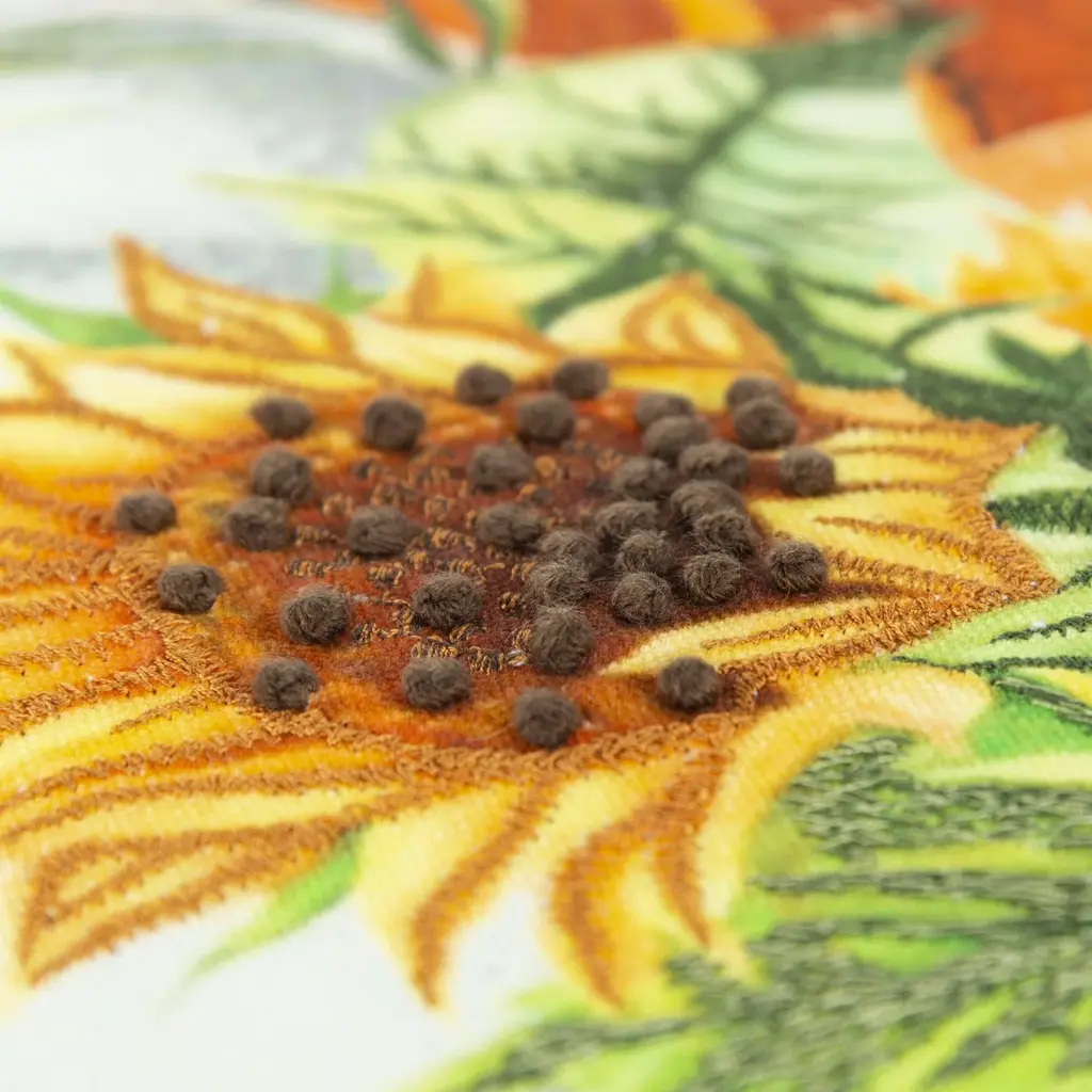 This colorful harvest-inspired accent pillow is a perfect addition to your home décor to welcome the changing of season. Measuring 20 x 20, this pillow is made from 100% cotton duck fabric, featuring digital print design coupled with delicate embroidery for texture and elegance. Featuring pumpkins in shades of orange amidst sunflowers and new Autumn rosehips, this decorative pillow creates a touch of warmth and charm from nature, right into your living space. The contrast eyelash fringe further enhances the beauty and depth of this piece.