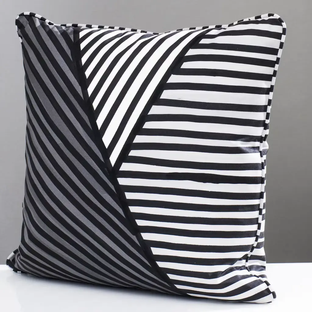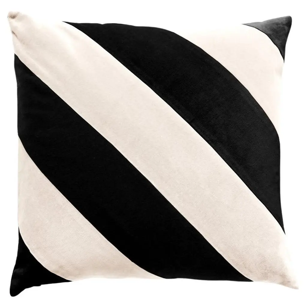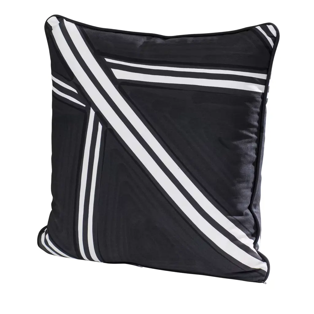 This elegant cushion has a down insert with a cover decorated using the pigment printing technique with striking parallel and perpendicular thin black lines over a dark grey and white background.