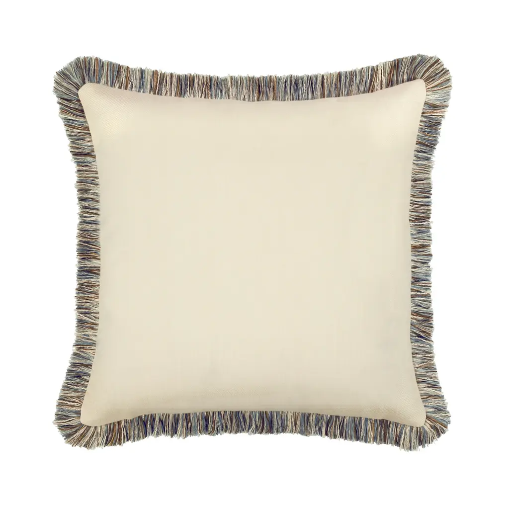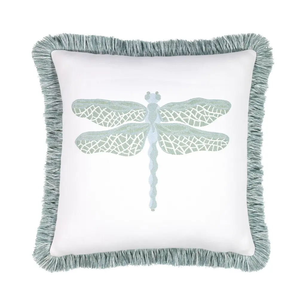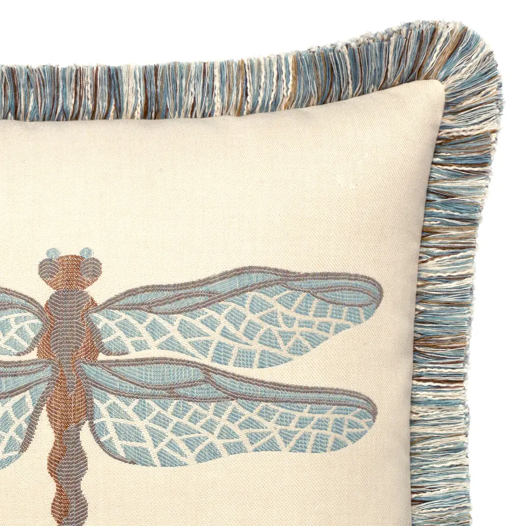Add a sophisticated tranquil element to your decor with this dragonfly pillow. Woven in spa and cocoa with coordinating fringe, it is gorgeously rich in texture. Features