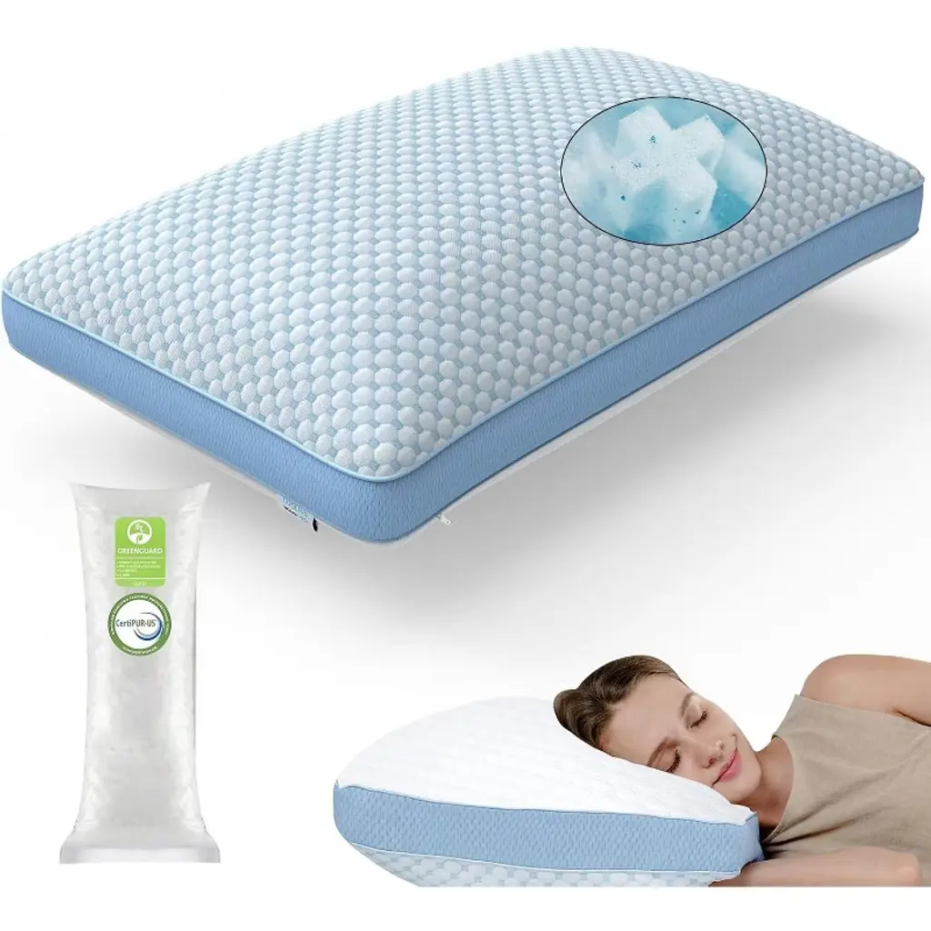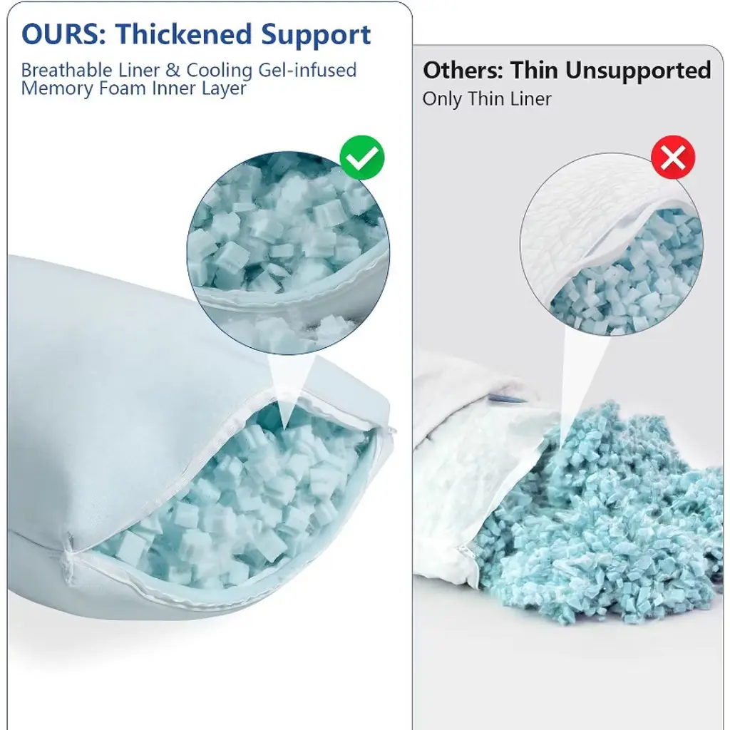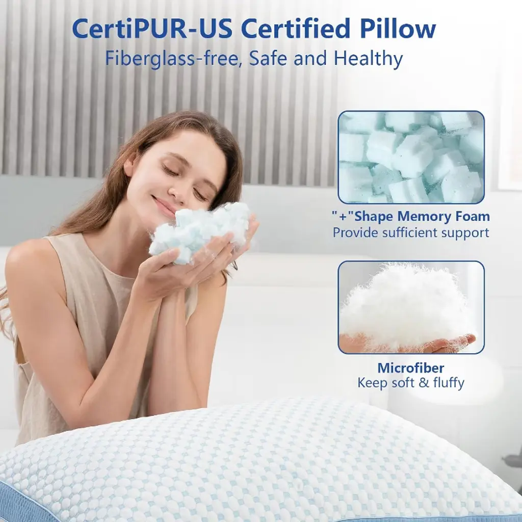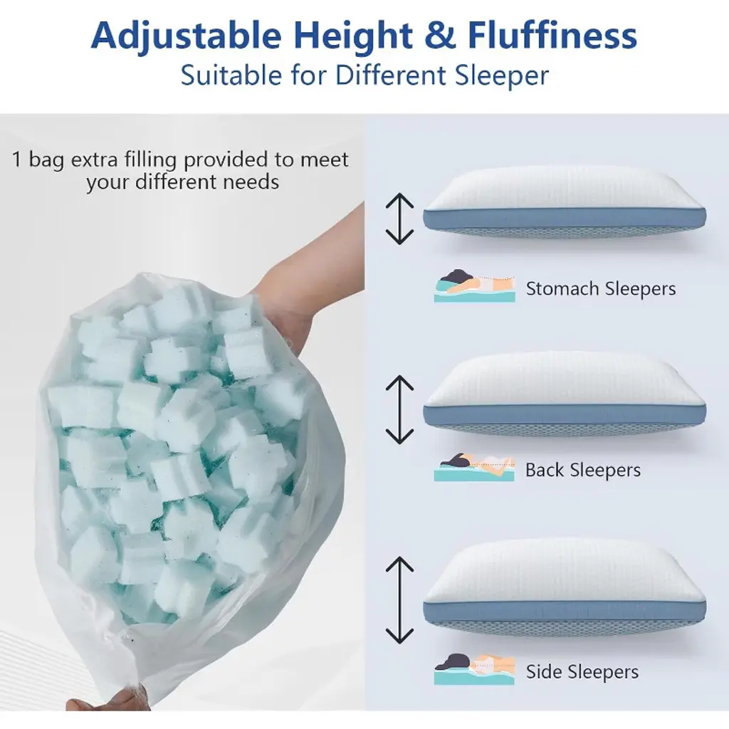 Cooling memory foam pillow designed with cooling fibers that truly keep you cool. The cooling side is made of cooling ice silk fabric, and the soft side is made of ultra-breathable fiber material, providing you with a healthier, cooler sleeping atmosphere. Unlike traditional pillows, fillings of these shredded memory foam pillows could be added or removed to suit your size, shape, or sleep position. It can provide maximum comfort in any sleeping position and is perfect for sleeping on the side, stomach, and back. The memory foam pillow for sleeping is a perfect choice for all sleepers. We use freshly produced "+" shaped shredded memory foam and microfiber to ensure better softness and support. Each package comes with a 0.45 lb bag of fill to meet different needs. Double-sided pillow, featuring cooling ice silk material on one side and soft rayon on the other side! This bed pillow will provide personalized support to your head, neck, and shoulders, relieving pain and enhancing your sleep. Perfect Christmas, birthday, Mother's Day, or Father's Day gift for friends and families.