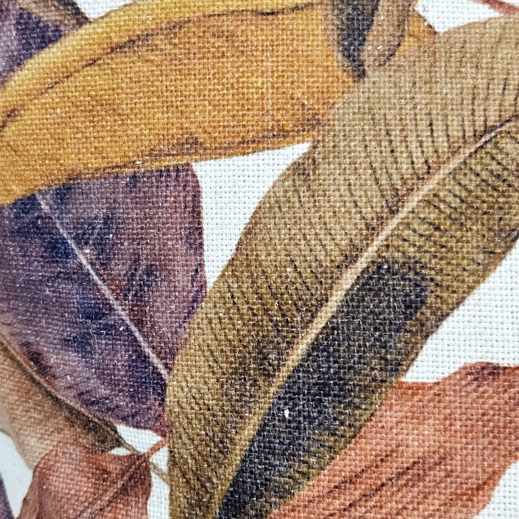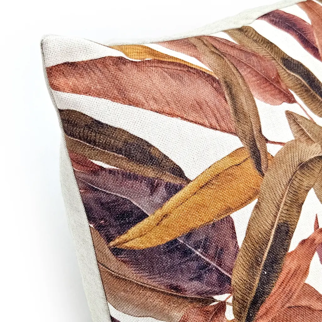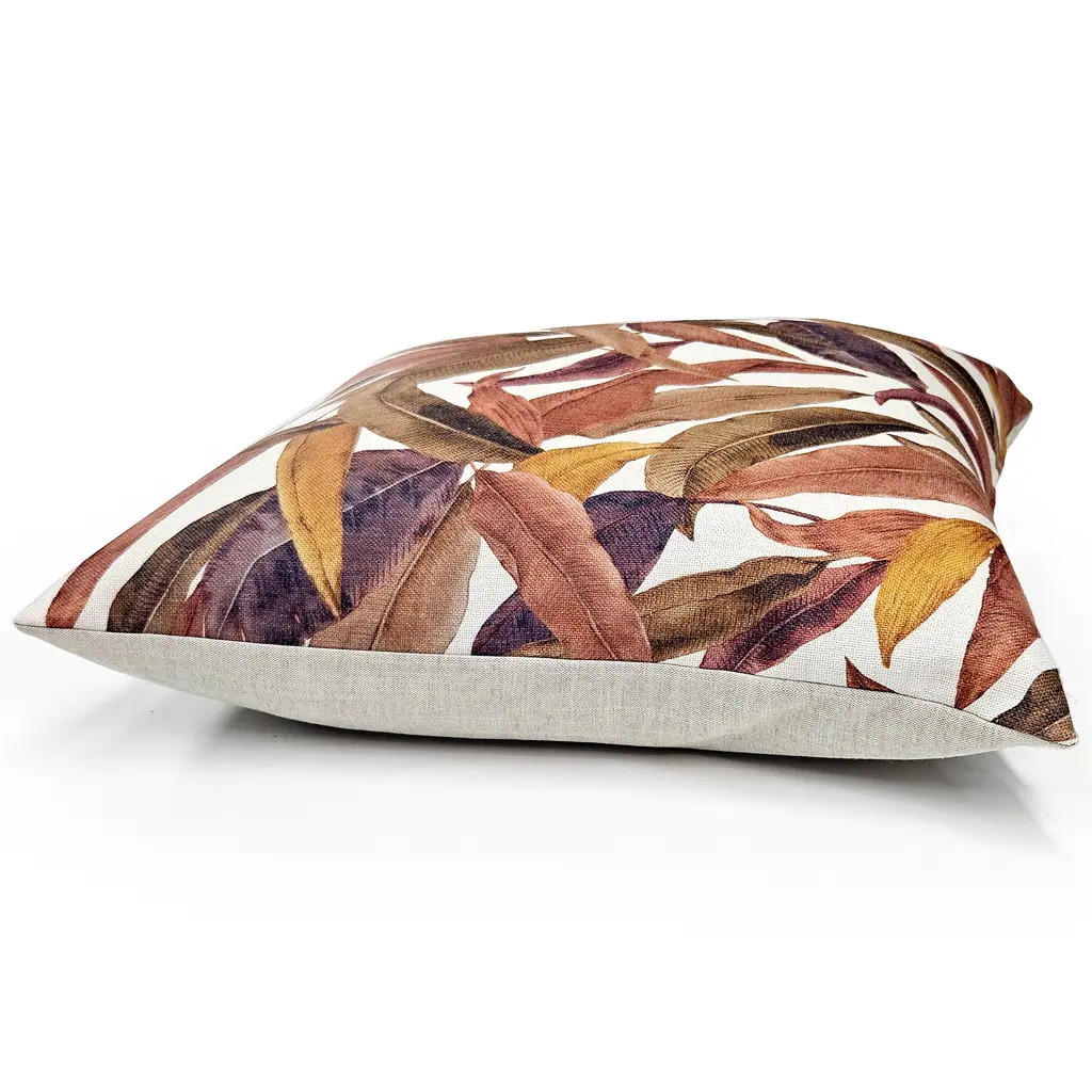 Brown, Burnt Orange, Muted Gold, and Dark purple colored leaves adorn the Easy Breezy Paradise Throw Pillow. Made from a durable 100% polyester fabric, this 22 inch square pillow will make a great addition to any room that sees a lot of use and is in need of a punch of color. Size: 22"x22" Square Fabric: 100% Polyester Design on front only. Same fabric in solid white on back. Knife edge seams. Inside seams are reinforced for strength and durability. Hidden zipper closure Cold water wash separately on delicate. Air dry Made in Canada: Designed and made in Pillow Decor's Vancouver workroom.