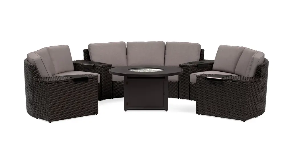Lightweight and durable, Echelon is great for balconies, terraces or around the pool. When extra seating is needed for large gatherings or more space to play, the dining chair, lounge chair and chaise are stackable.Includes two Echelon Sling Lounge Chairs, two Echelon Sling Swivel Rocking Lounge Chairs, a Meridian 54" Round Fire Table, Round Fire Table Top Windscreen, and Fire Media.Frame Finish: CarbonFire Table Top Finish: QuarryFire Table Base Finish: CarbonSling Fabric: System DunePillows not includedEchelon Sling Lounge Chair: W 28" x D 26.5" x H 33"Echelon Sling Swivel Rocking Lounge Chair: W 28" x D 27.5" x H 33"Meridian 54" Round Fire Table: W 54" x D 54"x H 27"