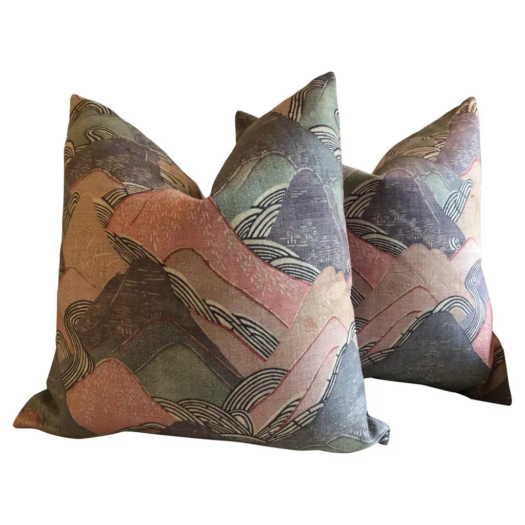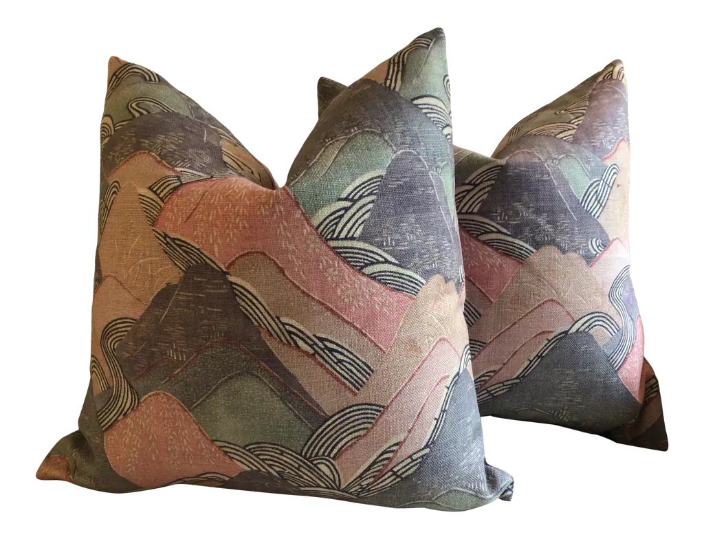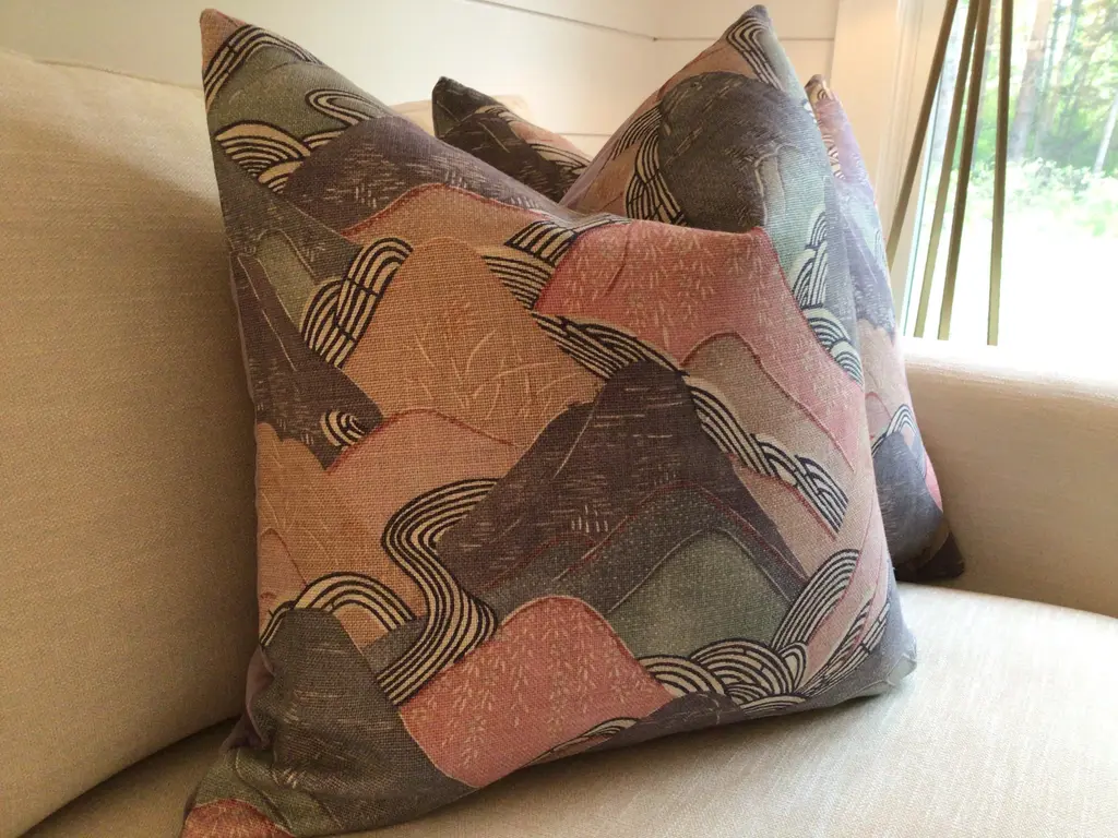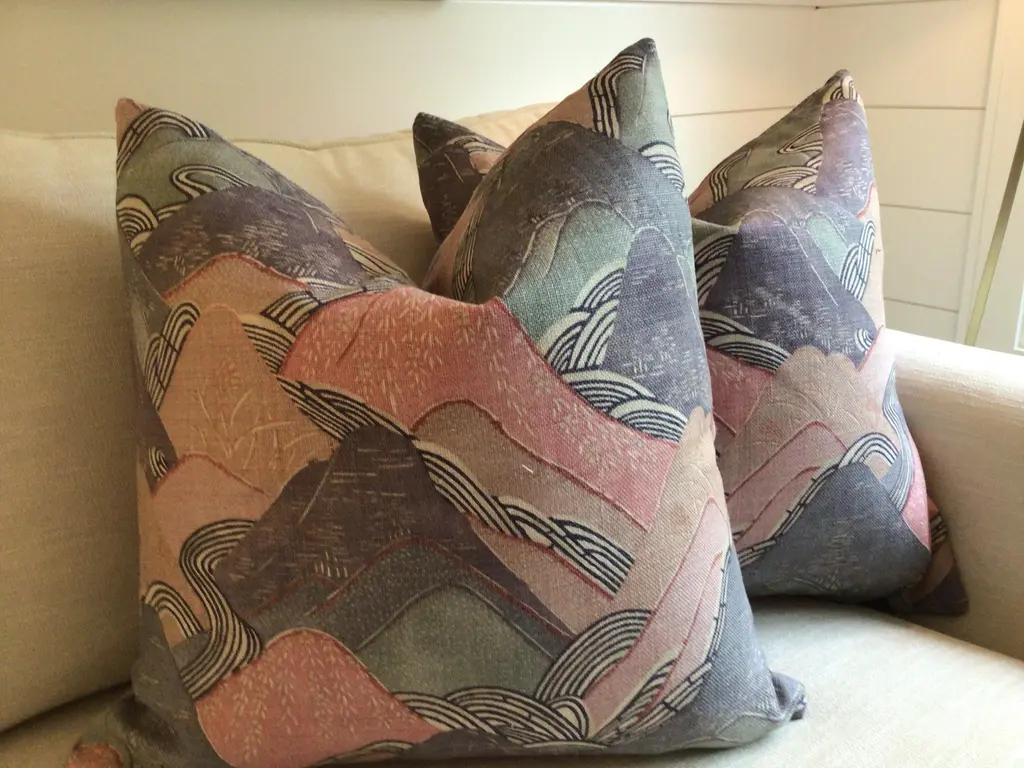 Another hit! “Edo” in opal is a stunning linen fabric in swirling tones of lavender, soft pink, pale peach, and green. Back is a coordinating PLUSH lavender velvet...and closure is by way of invisible zipper. Your order will come as a 22” pair, filled with generous down inserts, and ready for use.