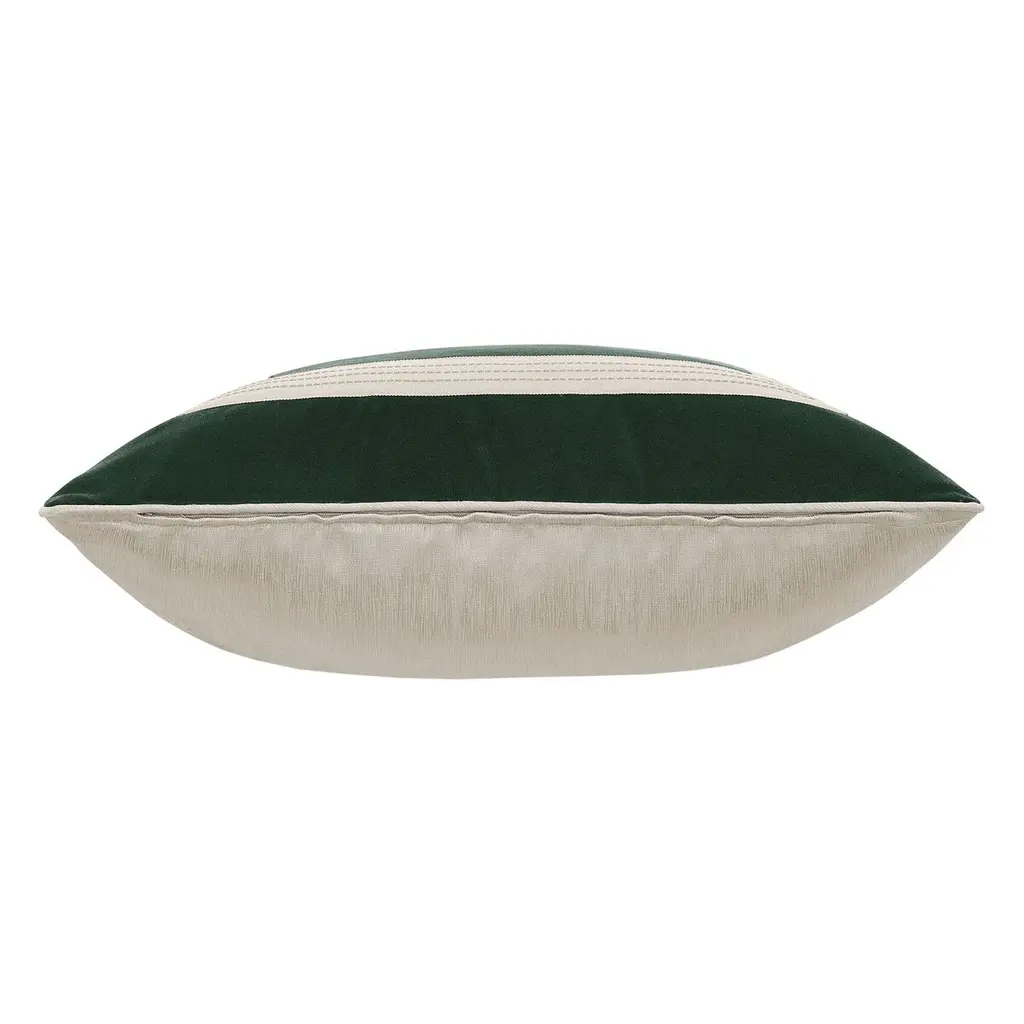 Green velvet fabric face with mitered border trim. Reverses to Gleam Champagne. Small welt edge finish. Pillow Insert included. Zipper closure. Dry clean only.