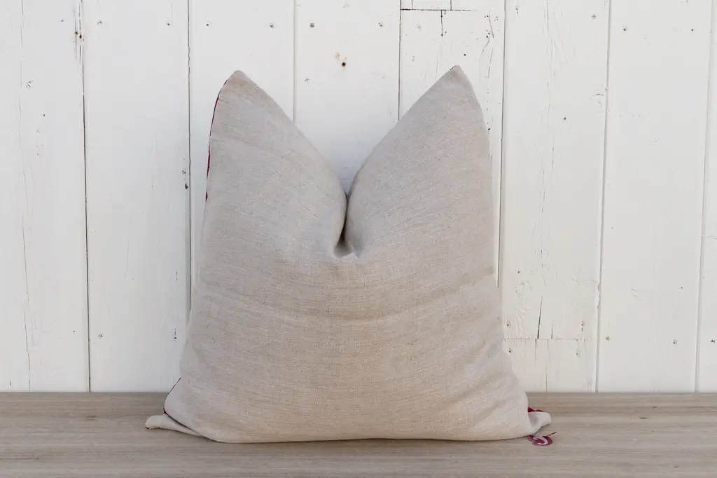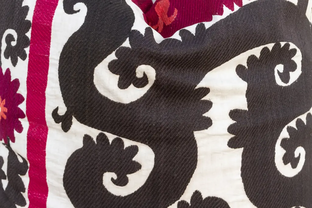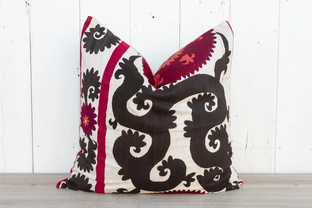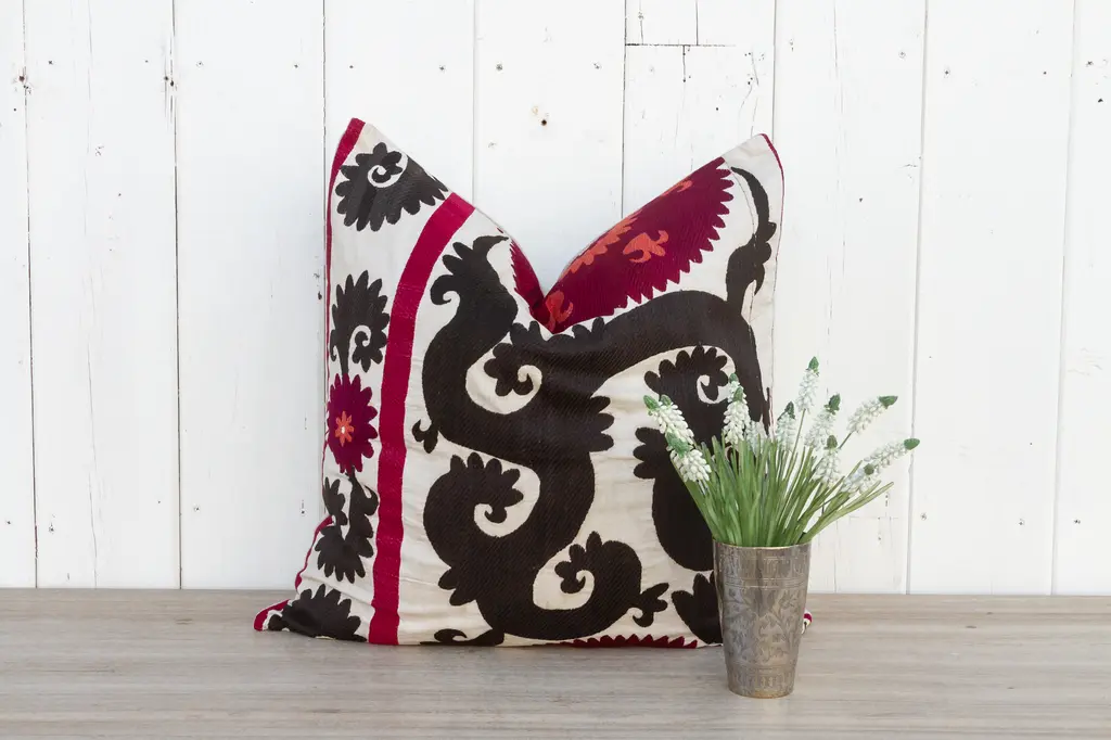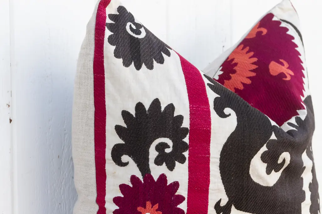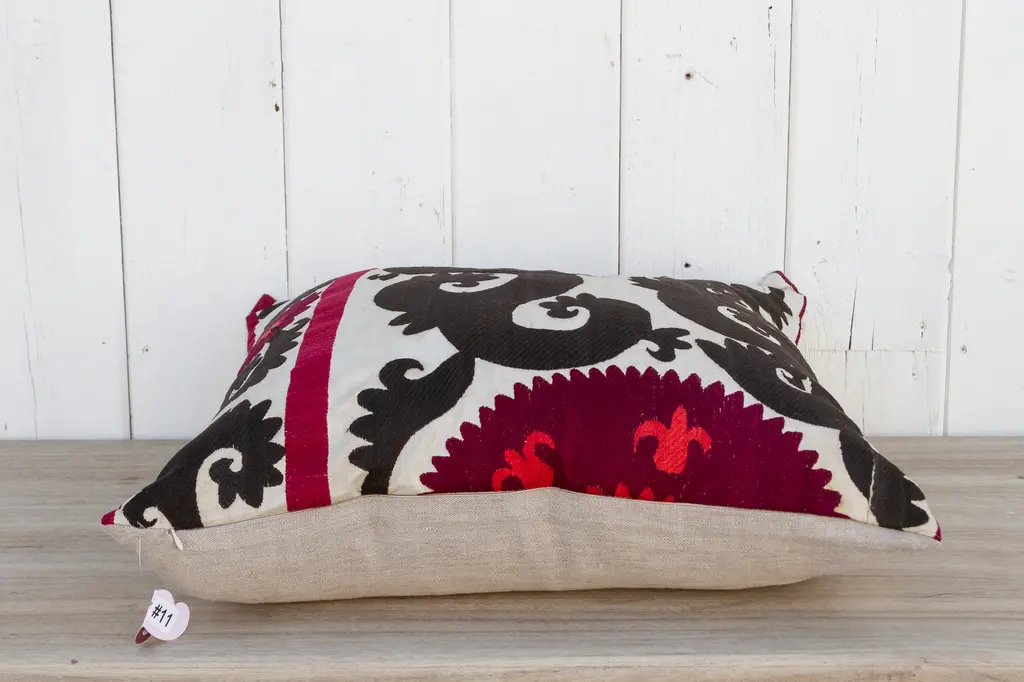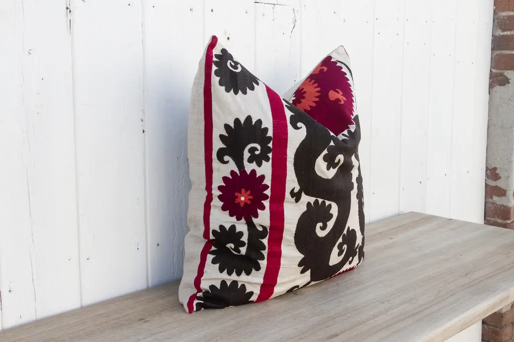 Suzani embroidery is known for its vibrant colors and intricate designs. This vintage Suzani pillow features intricate hand done embroidery on cotton or silk fabric, with colorful thread work in a variety flowers, leaves & vines motifs. This Suzani artform has been reimagined as bohemian pillow covers by carefully cutting and sewing them with a modern linen backing and hidden zipper closure. This pillow shows slight discolorations and small stains due to age.