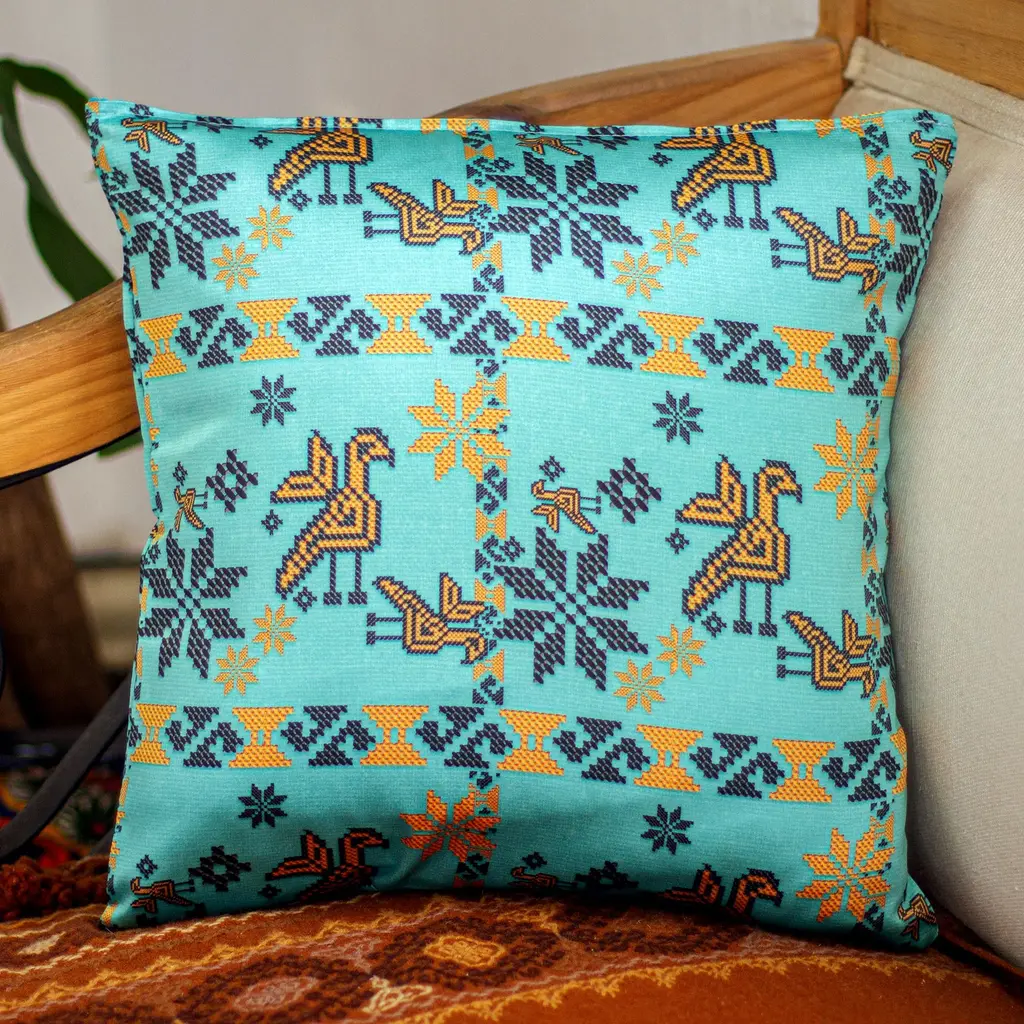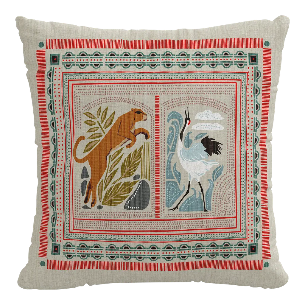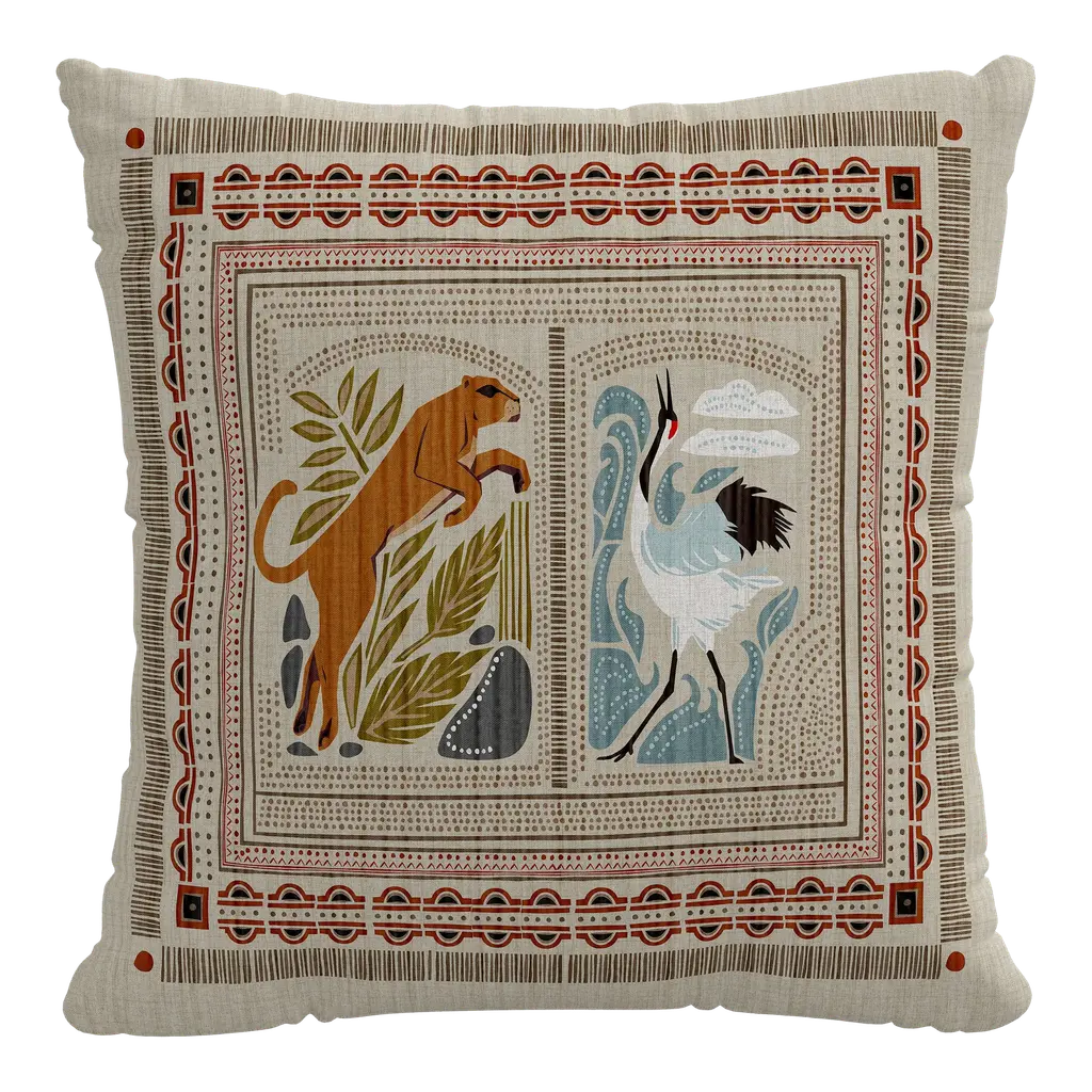 With an embroidered and appliquéd animal motif suggestive of indigenous paintings. This textured linen pillow adds a collected vibe to any décor.
