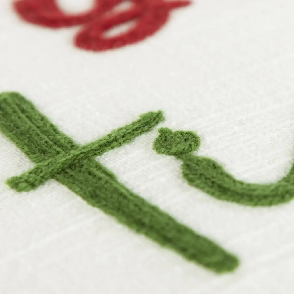 We bring you this 20 x 20 cotton slub accent pillow that's perfect for adding some festive charm to any room this holiday season! This fun, modern craft design features light hand beaded embroidery and three whimsical cotton corner tassels per corner in bold colors of red, green, black and gold against a crisp ivory canvas. This cheerful accent pillow with the holiday sentiment, Don't get your tinsel in a tangle, is perfect as a conversation starter for seasonal guests or for a Christmas or holiday party. It's the perfect way to add some seasonal personality to any charming interior space this year.