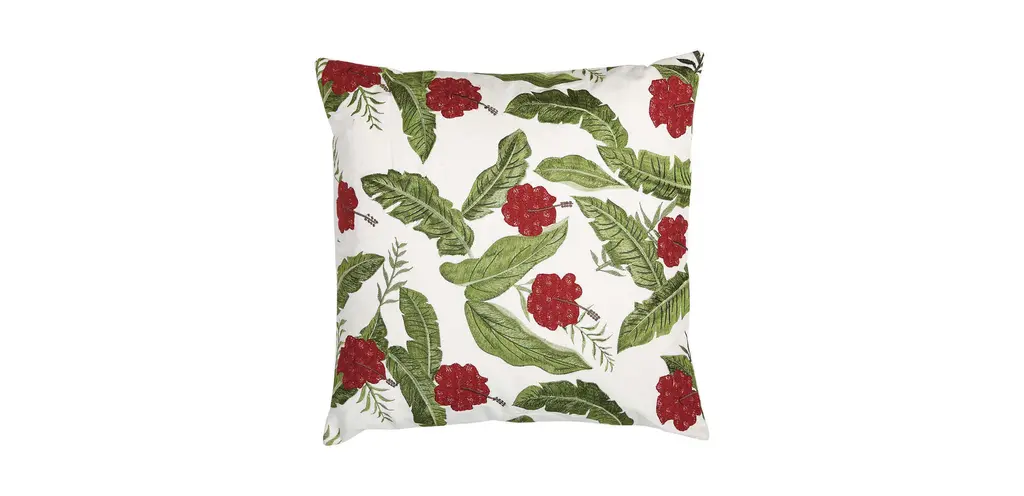 Add a tropical twist to your bedding ensemble or sofa with this colorful cotton embroidered throw pillow. The front face features a beautifully stitched modern hibiscus pattern and reverses to a solid white back. Made from 100% cotton with knife-edge hems, these fashionable floral throw pillows allow a clean, modern attitude to bloom, wherever you place them.