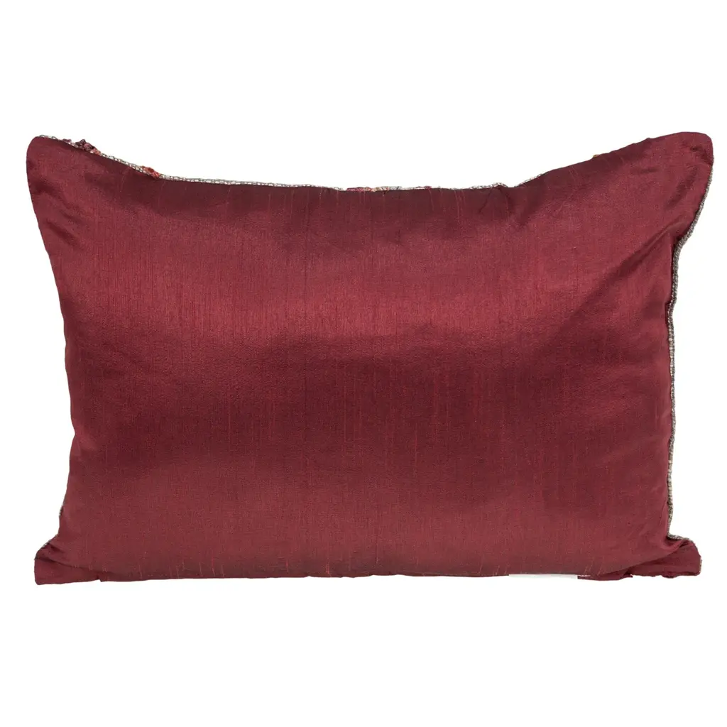 Add a touch of artistry to your space with the multicolor pillow. Features a striking tapestry pattern that instantly elevates any room with its unique charm. Perfect for a sofa, chair, or bed ensemble, this meticulously woven piece blends beige, pink, brown, and gray tones for a sophisticated yet inviting look. This durable accent pillow includes a plush poly insert for lasting comfort. Product Features: Color(s): gray, beige, pink, brown, and burgundy red Showcases a textured and embroidered tapestry design Design is on one side only - reverse is solid (red) Handmade rectangular pillow Removable cover with zipper closure for easy cleaning Care instructions: spot clean only Recommended for indoor use Dimensions: 14"H x 20"W x 6"D Material(s): Shell: cotton Filling: polyester