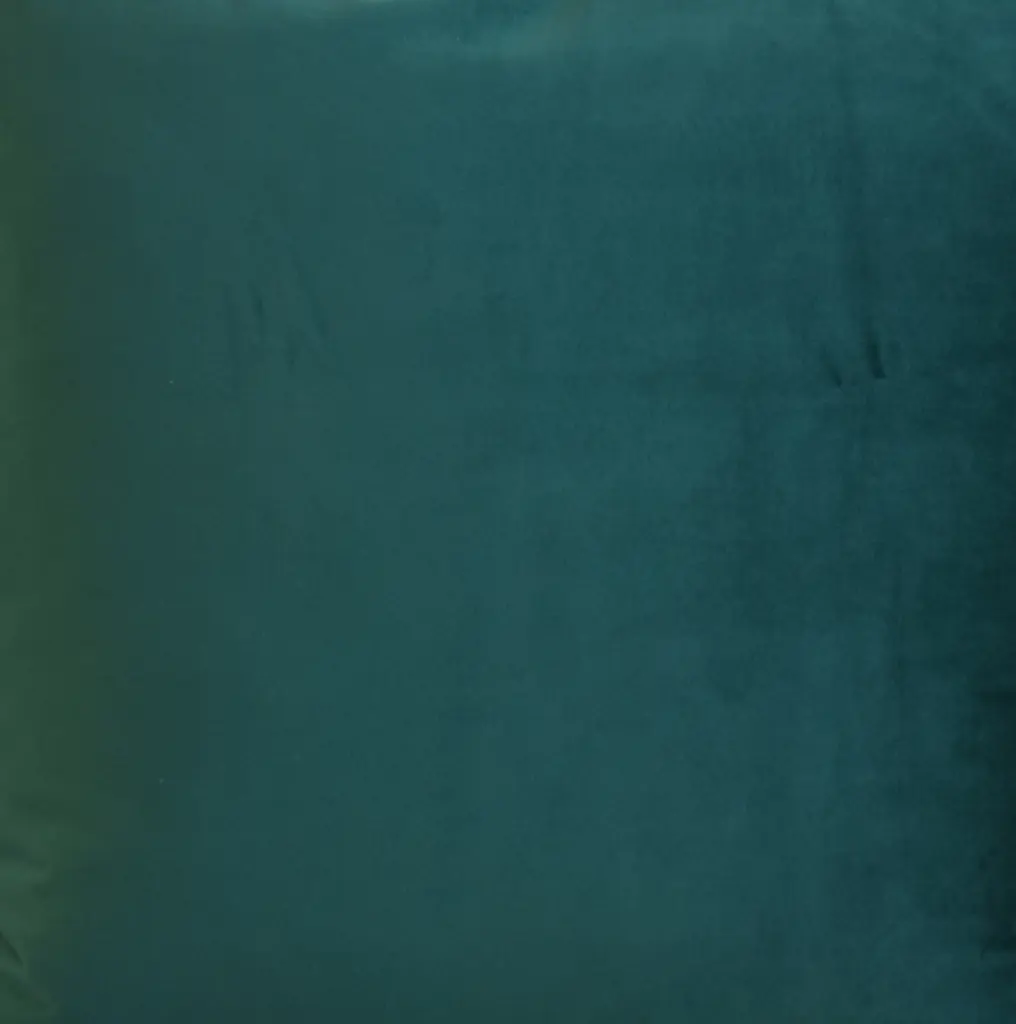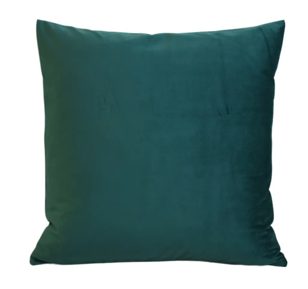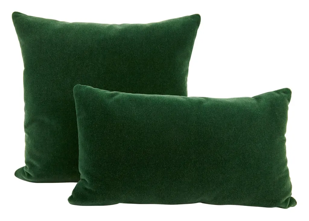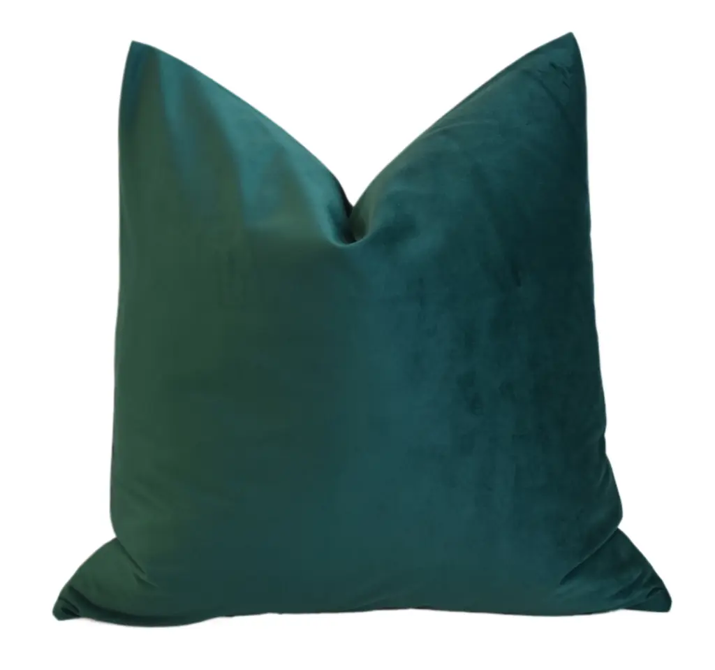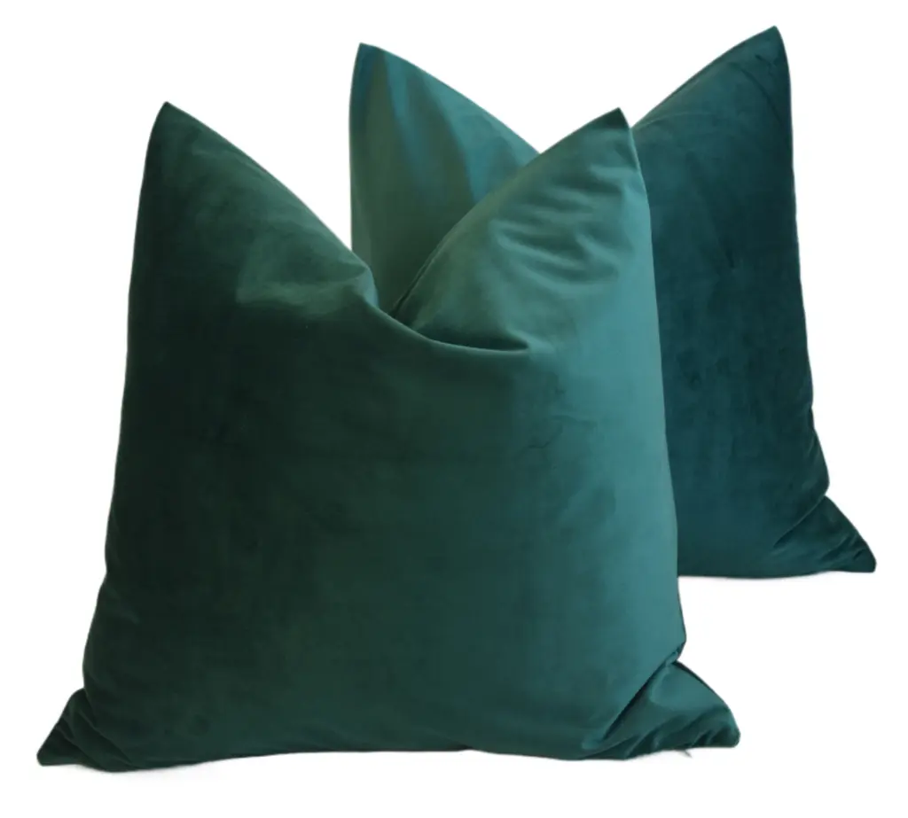 Pair of custom-tailored pillows in a solid emerald green-colored velvet. Same fabric on the back. Zipper closures. New plump goose feather-and-down inserts. Excellent new, unused condition!!!!