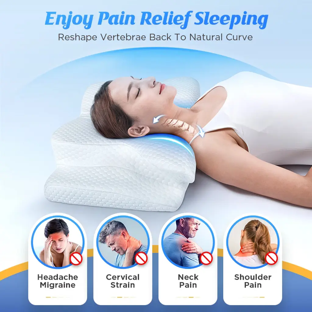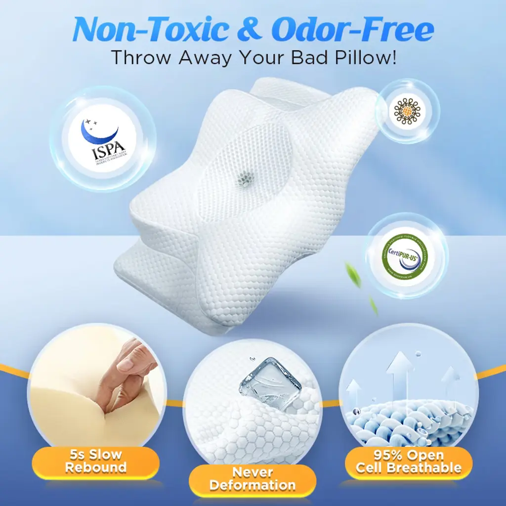ULTRA BUTTERFLY BUTTON PILLOW: THE SLEEP REVOLUTION IS HERE! Engineered with an innovative design featuring a unique hollow and butterfly-patented contour, Emircey neck pillows revolutionize your sleep by mimicking the human anatomy. This contour molds airtight to your head's shape, aligning your entire body spine naturally and reducing cervical stress to the maximum. And it also offers ample space for your shoulders without feeling cramped or constricted. It's your secret to pain-free mornings. VERSATILE PILLOW FOR TAILORED PAIN RELIEF - Whether you like side, back, or stomach sleeping, our cervical neck pillow is your ally in achieving a pain-free sleep experience. Specially crafted with curves, divots, and angles, this orthopedic pillow offers complete support for your neck and shoulders, allowing you to shift positions comfortably. Enjoy the added armrests ensuring your hands don't wake up numb. Emircey Contour Pillow is your ultimate pursuit of luxury, pain relief, and sleep. ADJUSTABLE HEIGHT BLISS - YOUR PILLOW, YOUR WAY! Every sleeper is unique, and our adjustable pillows cater to diverse needs by adding or removing inserts. The removable insert (0.8'') at the bottom provides more choices for higher or lower contours. And rotate it 180 degrees, you can get different heights (3.5'' & 3.1''). This guarantees you can maintain the 15-degree golden ratio for the perfect sleeping position. If you have a higher need, simply contact us for an extra insert(ONLY THE US). EMBRACE YOUR HIGH-QUALITY & BREATHABLE COOLING PILLOW! Worried about hot sleep? Fear not! The 3D mesh pillowcases and open-cell memory foam facilitate optimal heat dissipation, offering you a cool and refreshing night's sleep. Crafted with high-quality CertiPUR-US & Oeko-Tex certified memory foam, it offers a unique slow-rebound feature that provides firm support. This innovative material retains its shape and firmness, ensuring a durable and consistent experience throughout the seasons. HASSLE-FREE PURCHASE EXPERIENCE! It's time to buy Emircey contour pillows for embracing healthy sleep! If you have any inquiries about our neck pillows for pain relief sleeping, please feel free to contact our customer service. It's a good gift for dad, mom, fathers, mothers, girlfriends, boyfriends, husbands, wife & colleagues, birthdays Christmas gifts. Buy Emircey ergonomic pillow for neck pain! Experience the bliss of pain-free sleeping!