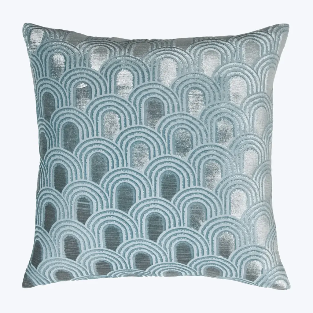 Elevate your interiors with the Endless Velvet Pillow Robin’s Egg by Kevin O’Brien Studio. Handcrafted in a beautiful silk blend, this stunning pillow features a deco-inspired design of interlocking arches. An exquisite addition to luxe, retro-influenced spaces. Made in Philadelphia by expert textile artisans. Style with the Endless Velvet Pillow Thistle and the Endless Velvet Pillow Pacific.