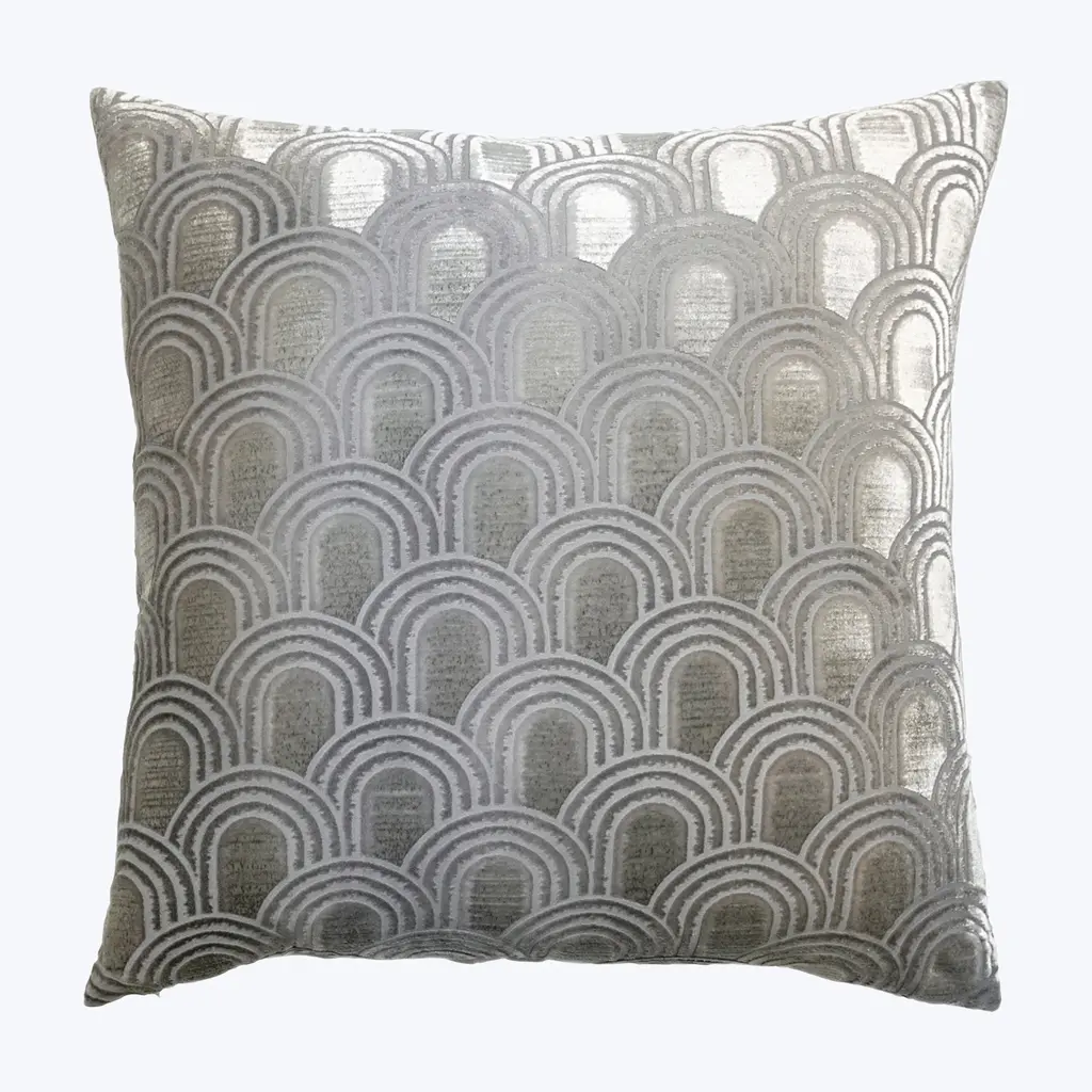 Elevate your interiors with the Endless Velvet Pillow Silver by Kevin O’Brien Studio. Handcrafted in a beautiful silk blend, this stunning pillow features a deco-inspired design of interlocking arches. An exquisite addition to luxe, retro-influenced spaces. Made in Philadelphia by expert textile artisans.