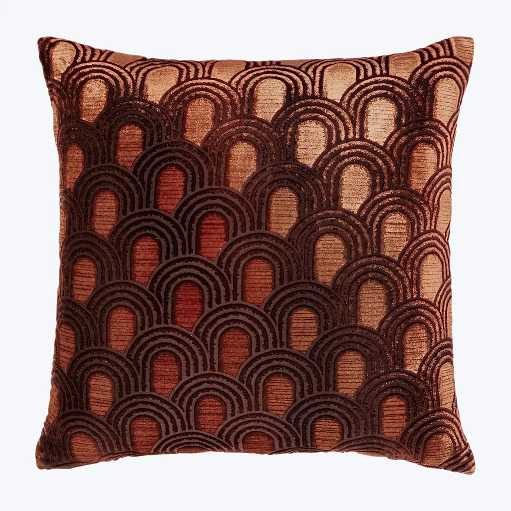 Elevate your interiors with the Endless Velvet Pillow Sunstone by Kevin O’Brien Studio. Handcrafted in a beautiful silk blend, this stunning pillow features a deco-inspired design of interlocking arches. An exquisite addition to luxe, retro-influenced spaces. Made in Philadelphia by expert textile artisans.