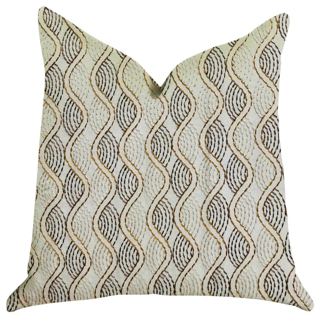 Enrich your space with the addition of enigma twist luxury throw pillow. The fabric of this trendy pillow is a blend of Cotton, Linen, and Viscose.• Colors: Beige, Gold• Fabric Origin: India. Pillows are Handmade in USA• Double Sided pillow• Invisible zipper enclosure for a tailored look• All seams are over-locked and stitched for a professional finish• Pattern placement may vary slightly• Pillow measurements are seam to seam from the inside• Pillows include • Made in USA• Hypoallergenic Down Alternative Polyfill Insert• Dry Clean recommended• Fabric Content: 59% Cotton 41% Linen 100% Viscose• Flammability: CAL 117-2013, NFPA 260, UFAC I