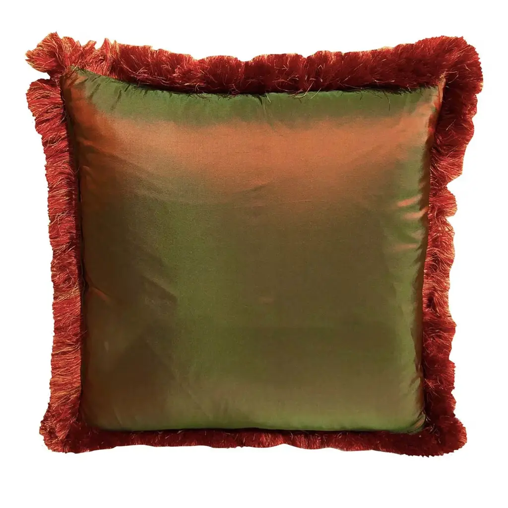 The striking juxtaposition of contrasting colors and textures make this comfortable cushion an eye-catching and modern addition to an elegant decor. Its down filling is covered with a silk shimmering upholstery in a unique olive green shade. The vibrant red fringe that marks its perimeter is also in silk, creating a dynamic textural effect. This stunning piece can be combined with others by the same atelier for a colorful look.