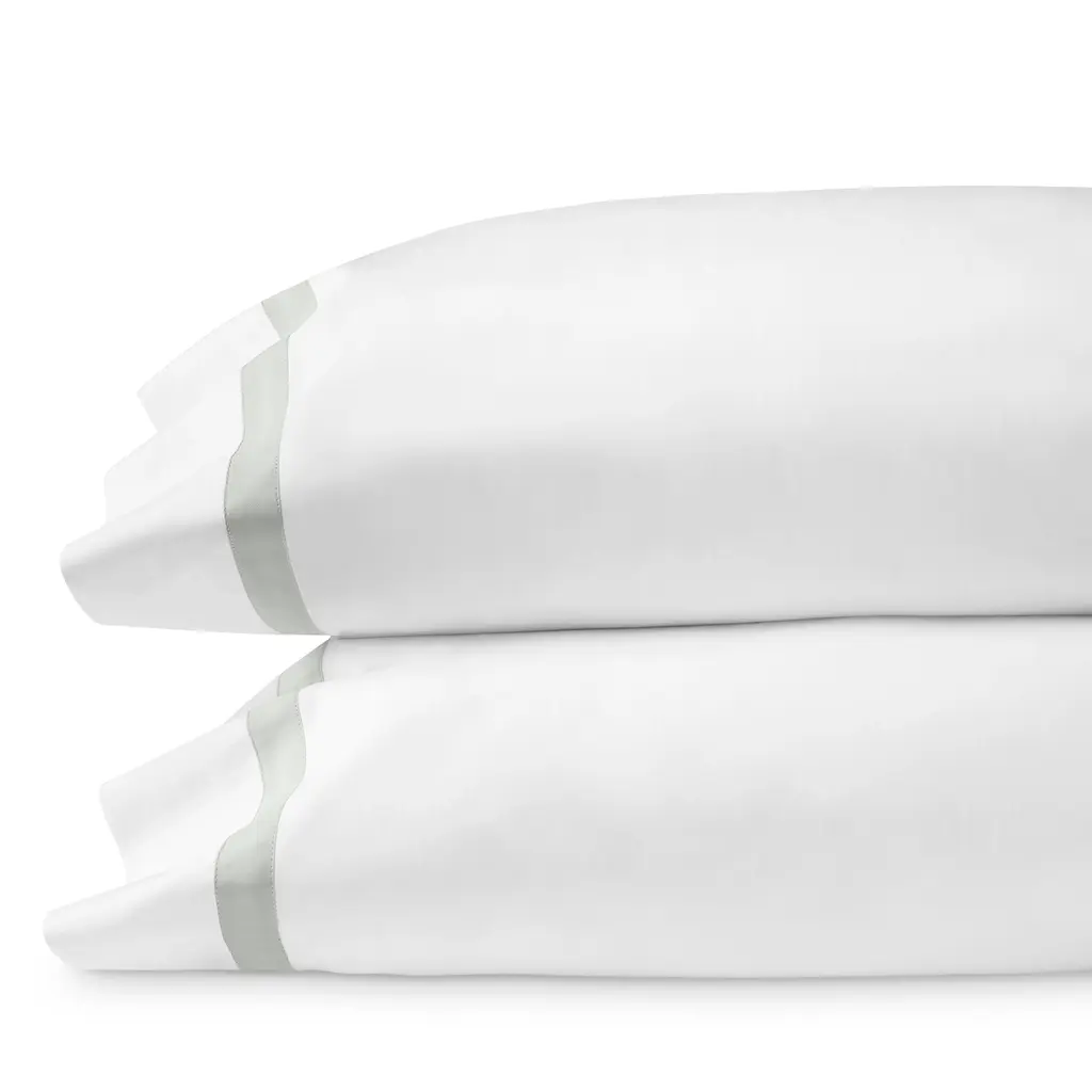 The understated sophistication of Estate's crisp white, Italian-woven long-staple cotton base is an immaculate backdrop for lustrous sateen appliqué detail, beautifully bordering this collection to create a sense of tailored elegance.