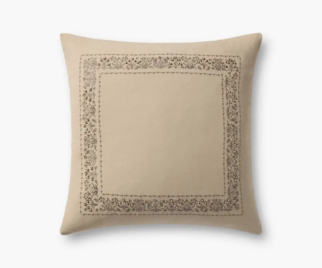A subtle accent with delicate details, this versatile, cream-colored pillow is bordered with embroidery. Part of our Rifle Paper Co. x Loloi collaboration.