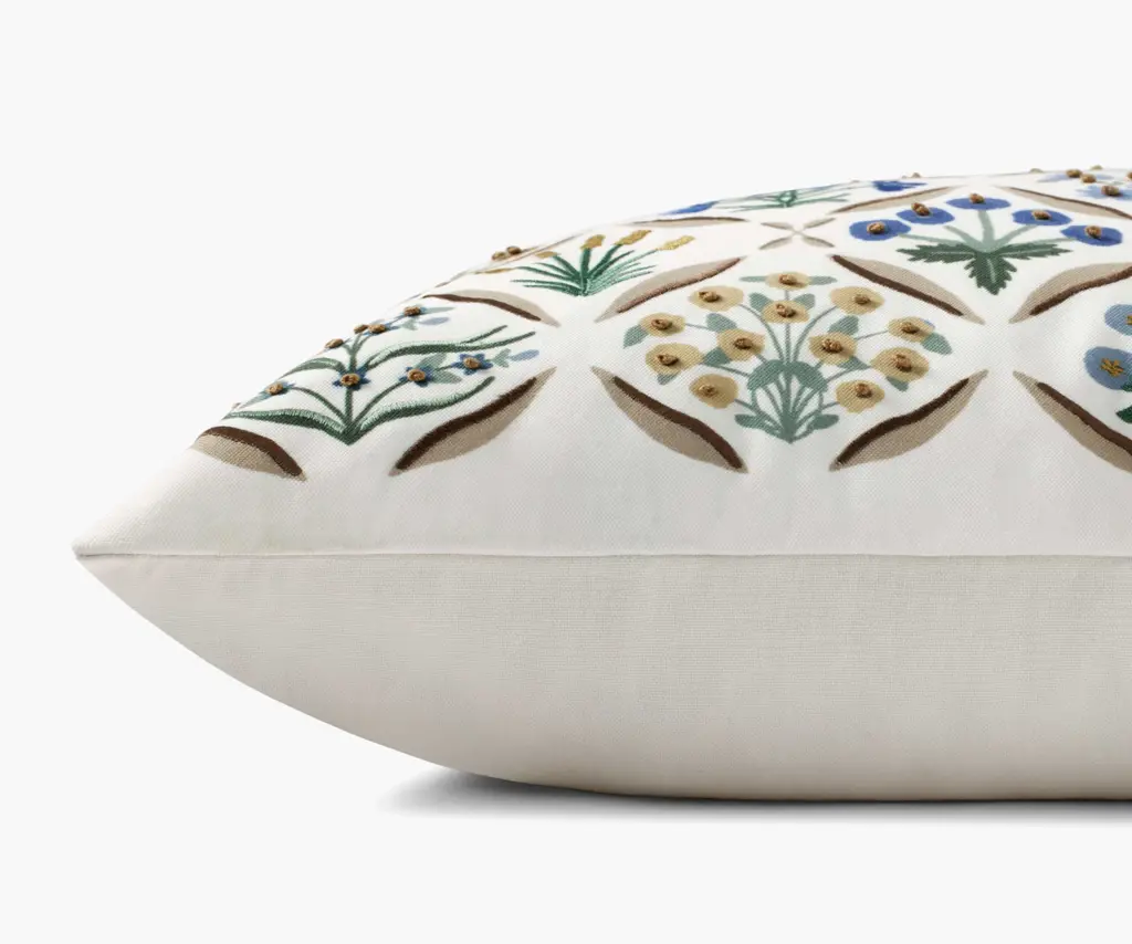 Green leaves create a crosshatch grid filled with botanicals, accented by embroidery and beads. Part of the Rifle Paper Co. x Loloi collection.