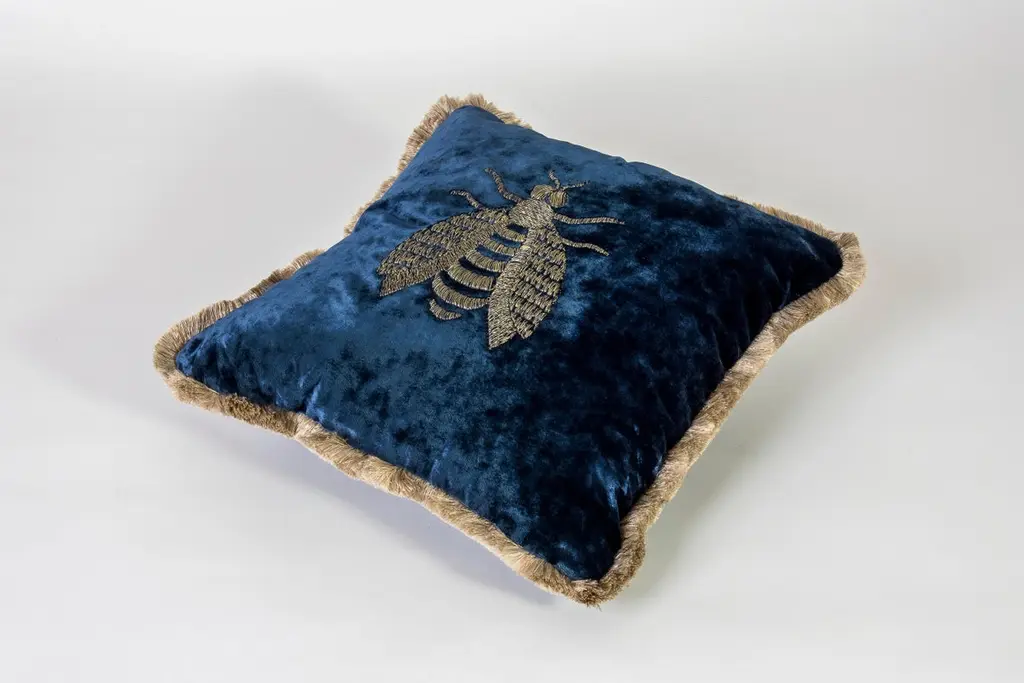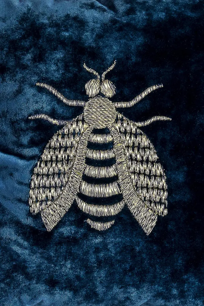 Estensi Cotton Velvet Pillow With Embroidered Queen Bee, Blue Color