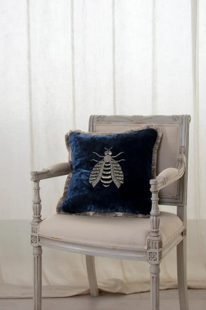 Our Bee pillow, embroidered on cotton velvet, is an exclusive piece of furniture that combines the elegance of the decorative pattern with the preciousness of the materials.The soft velvet provides a pleasant tactile sensation, while the original embroidery workmanship, done with special metallic luster yarns, recreates the effect of a metal foil corroded by time, giving a unique and sophisticated appeal.The absolute star of the pillow, the bee is a symbol of nature's harmony. Its pattern, made with a skillful interweaving of metallic yarns, gives a striking textural effect, enhanced by the contrast between the velvety surface and the brightness of the embroidery.A perfect blend of traditional craftsmanship and contemporary design, this pillow is not just a decorative accessory, but an authentic element of style, capable of enriching any room with refinement and personality.When ordering, please specify the desired color.
