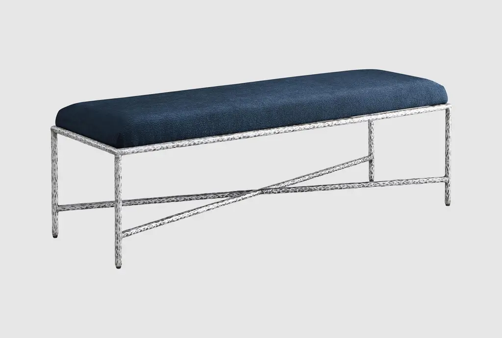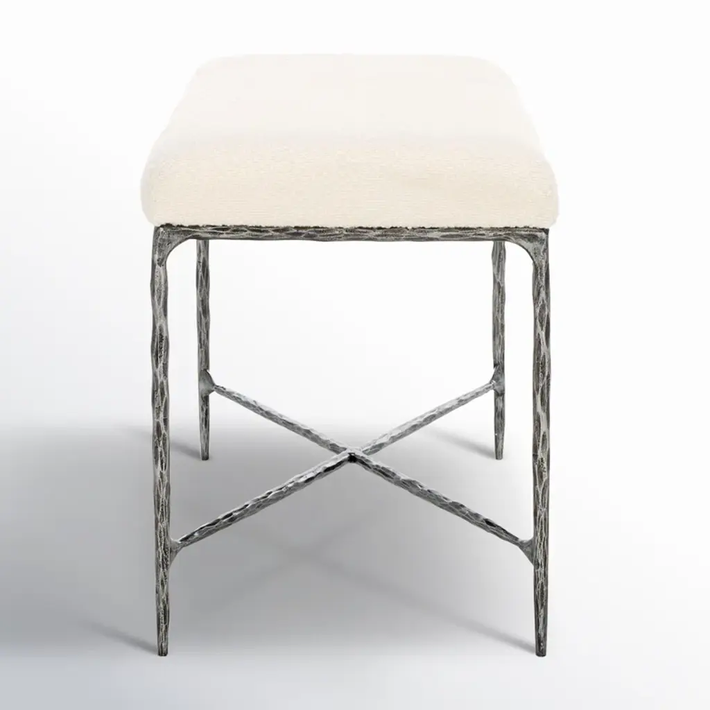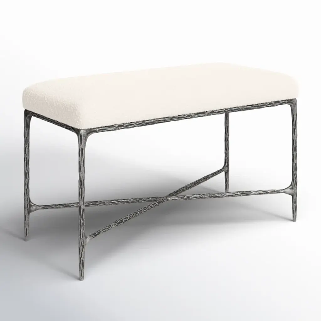 Effortlessly balanced, our upholstered bench blends bold materials with a dynamic silhouette. A horizontal crossbar connects slender, slightly curved X-shaped legs for added stability. Wrapped in bouclé-like fabric, the seat is foam-padded for just the right amount of support. We love this piece styled with a couple throw pillows for an extra inviting look.